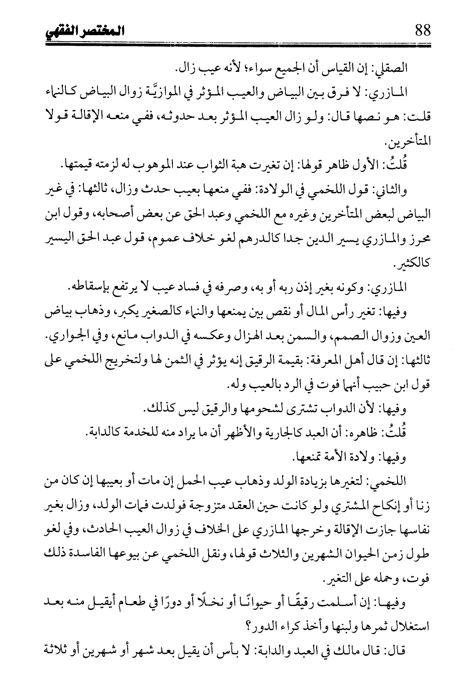 وفيها: تغير رأس المال أو نقص بين يمنعها والنماء كالصغير يكبر، وذهاب بياض العين وزوال الصمم، والسمن بعد الهزال وعكسه في الدواب مانع، وفي الجواري.