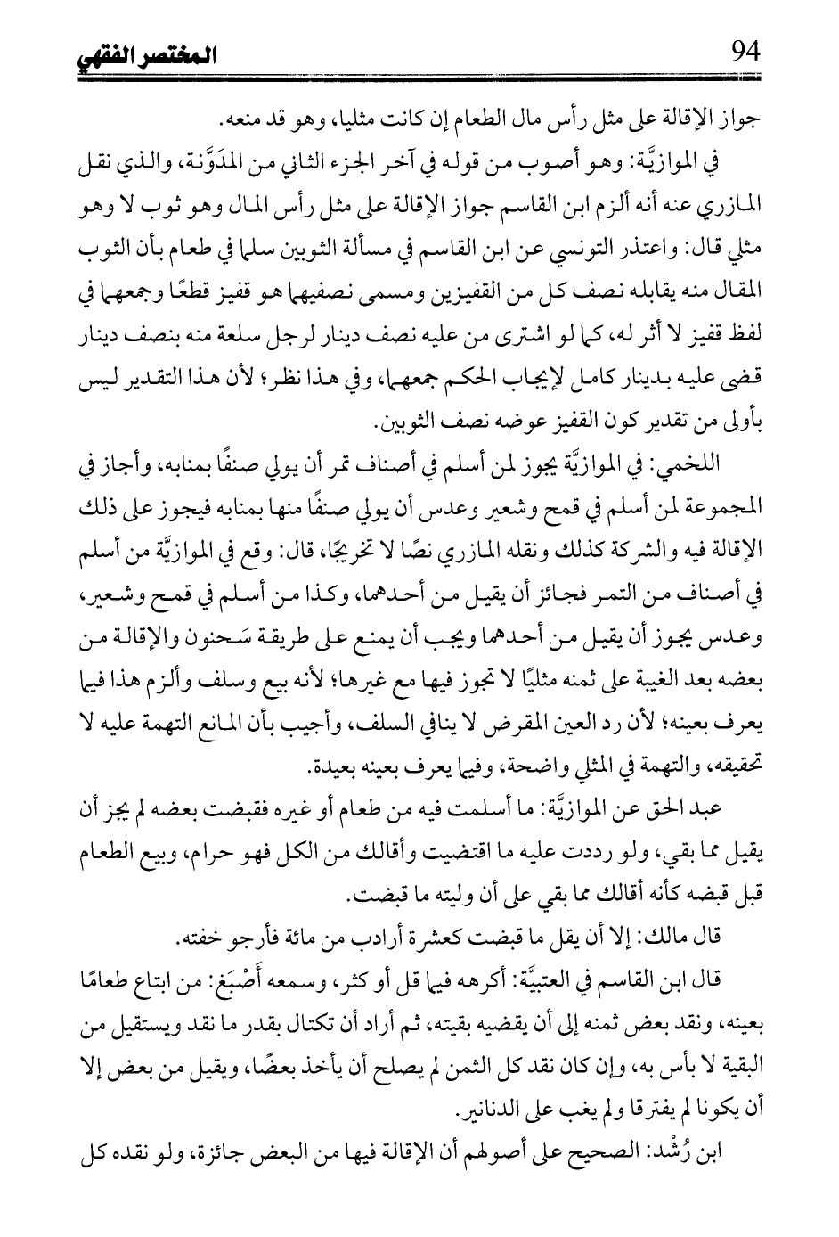 ابن رُشْد: الصحيح على أصولهم أن الإقالة فيها من البعض جائزة، ولو نقده كل