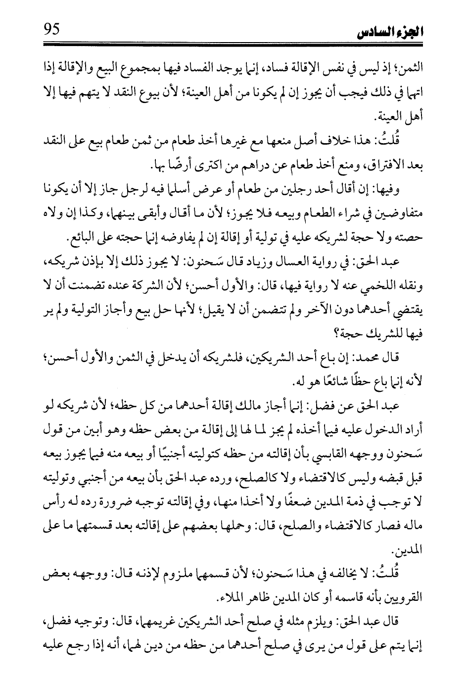 عبد الحق: في رواية العسال وزياد قال سَحنون: لا يجوز ذلك إلا بإذن شريكه، ونقله اللخمي عنه لا رواية فيها، قال: والأول أحسن؛ لأن الشركة عنده تضمنت أن لا يقتضي أحدهما دون الآخر ولم تتضمن أن لا يقيل؛ لأنها حل بيع وأجاز التولية ولم ير فيها للشريك حجة؟