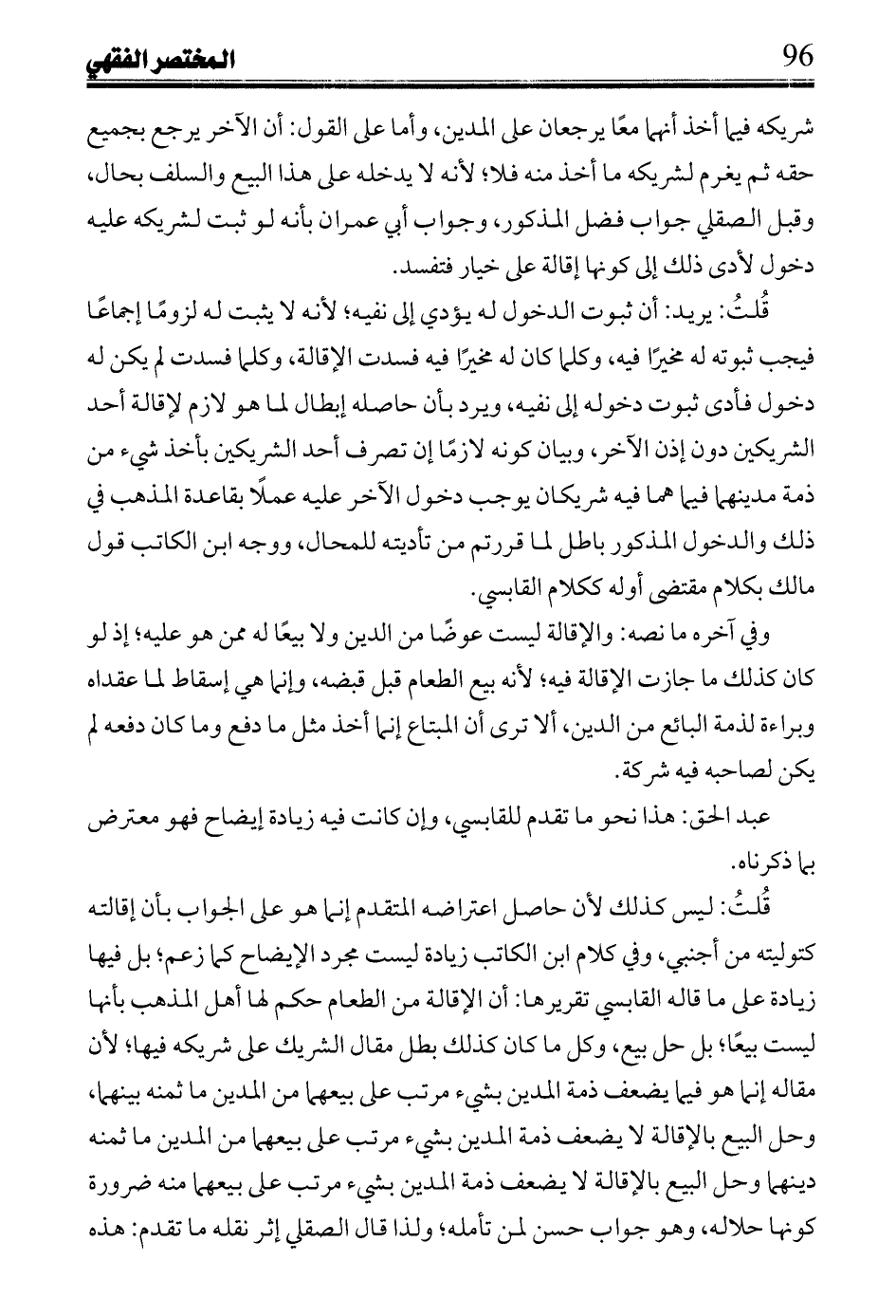وفي آخره ما نصه: والإقالة ليست عوضًا من الدين ولا بيعًا له ممن عليه؛ إذ لو كان كذلك ما جازت الإقالة فيه؛ لأنه بيع الطعام قبل قبضه، وغنما إسقاط لما عقداه وبراءة لذمة البائع من الدين، ألا ترى أن المبتاع إنما أخذ مثل ما دفع وما كان دفعه لم يكن لصاحبه فيه شركة.