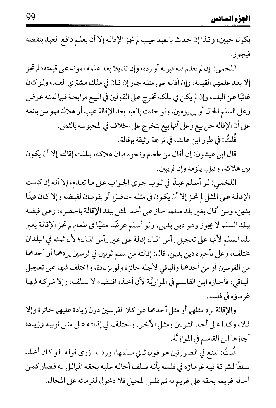 اللخمي: لو أسلم عبدًا في ثوب جرى الجواب على ما تقدم، إلا أنه إن كانت الإقالة على المثل لم تجز إلا أن يكون في مثله حاضرًا أو يقومان لقبضه وغلا كان دينًا بدين، ومن أقال بغير بلد سلمه جاز على أخذ المثل ببلد الإقالة بالحضرة، وعلى قبضه ببلد السلم لا يجوز وهو دين بدين، ولو أسلم عرضًا مثليًا في طعام لم تجز الإقالة بغير بلد السلم لأنها على تعجيل رأس المال إقالة على غير رأس المال؛ لأن ثمنه في البلدان مختلف، وعلى تأخيره دين بدين، قال: إقالته من سلم ثوبين في فرسين يردهما أو أحدهما من الفرسين أو من أحدهما والباقي لأجله جائزة ولو بزيادة، واختلف فيها على تعجيل الباقي، فأجازه ابن القاسم في الموازيَّة لأن أخذه اقتضاء لا سلف، وغلا شركة فيها غرماؤه في فلسه.
