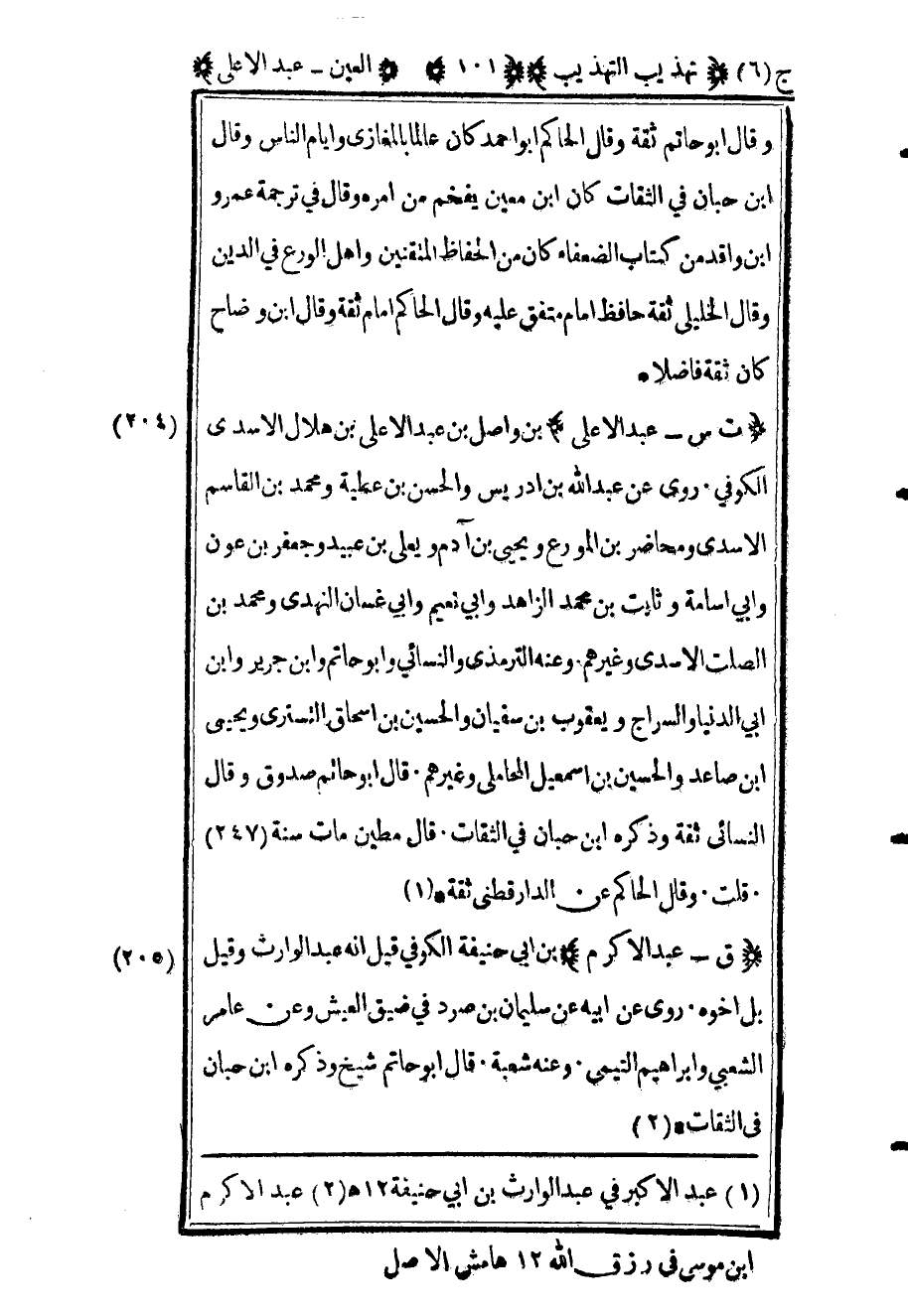 206 - "ت س عبد الأعلى" بن واصل بن عبد الأعلى بن هلال الأسدي الكوفي روى عن عبد الله بن إدريس والحسن بن عطية ومحمد بن القاسم الأسدي ومحاضر بن المورع ويحيى بن آدم ويعلي بن عبيد وجعفر بن عون وأبي أسامة وثابت بن محمد الزاهد وأبي نعيم وأبي غسان النهدي ومحمد بن الصلت الأسدي وغيرهم وعنه الترمذي والنسائي وأبو حاتم وابن جرير وابن أبي الدنيا والسراج ويعقوب بن سفيان والحسين بن إسحاق التستري ويحيى بن صاعد والحسين ابن إسماعيل المحاملي وغيرهم قال أبو حاتم صدوق وقال النسائي ثقة وذكره ابن حبان في الثقات قال مطين مات سنة "247" قلت وقال الحاكم عن الدارقطني ثقة.1