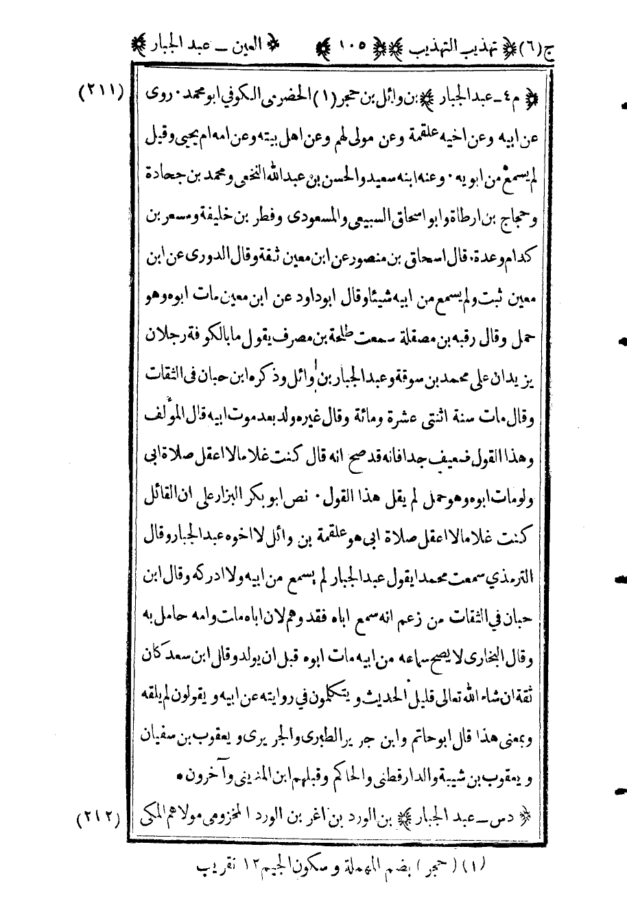 213 - "م 4 عبد الجبار" بن وائل بن حجر1 الحضرمي الكوفي أبو محمد روى عن أبيه وعن أخيه علقمة وعن مولى لهم وعن أل بيته وعن أمه أم يحيى وقيل لم يسمع من أبويه وعنه ابنه سعيد والحسن بن عبد الله النخعي ومحمد بن جحادة وحجاج بن أرطاة وأبو إسحاق السبيعي والمسعودي وفطر بن خليفة ومسعر بن كدام وعدة قال إسحاق بن منصور عن ابن معين ثقة وقال الدوري عن ابن معين ثبت ولم يسمع من أبيه شيئا وقال أبو داود عن ابن معين مات وهو حمل وقال رقبة بن مصقلة سمعت طلحة بن مصرف يقول ما بالكوفة رجلان يزيدان على محمد ابن سوقة وعبد الجبار بن وائل وذكره ابن حبان في الثقات وقال مات سنة اثنتي عشرة ومائة وقال غيره ولد بعد موت أبيه قال المؤلف وهذا القول ضعيف جدا فإنه قد صح أنه قال كنت غلاما لا أعقل صلاة أبي ولو مات أبوه وهو حمل لم يقل هذا القول نص أبو بكر البزار على أن القائل كنت غلاما لا أعقل صلاة أبي هو علقمة بن وائل لا أخوه عبد الجبار وقال الترمذي سمعت محمد يقول عبد الجبار لم يسمع من أبيه ولا أدركه وقال ابن حبان في الثقات من زعم أنه سمع أباه فقد وهم لأن أباه مات وأمه حامل به وقال البخاري لا يصح سماعه من ابية مات أبوه قبل أن يولد وقال ابن سعد كان ثقة إن شاء الله تعالى قليل الحديث ويتكلمون في روايته عن أبيه ويقولون لم يلقه وبمعنى هذا قال أبو حاتم وابن جرير الطبري والجريري ويعقوب بن سفيان ويعقوب بن شيبة والدارقطني والحاكم وقبلهم بن المديني وآخرون.