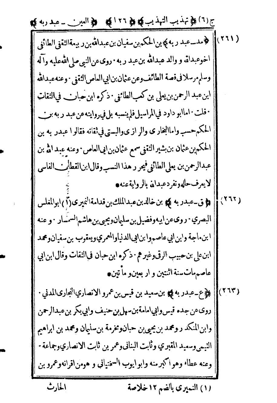 263 - "مد عبد ربه" بن الحكم بن سفيان بن عبد الله بن ربيعة الثقفي الطائفي أخو عبد الله ووالد عبد الله بن عبد ربه روى عن النبي صلى الله عليه وآله وسلم مرسلا في قصة الطائف وعن عثمان بن أبي العاص الثقفي وعنه عبد الله بن عبد الرحمن بن يعلى بن كعب الطائفي ذكره بن حبان في الثقات قلت أما أبو داود في المراسيل فلم ينسبه بل في روايته عن عبد ربه بن الحكم حسب وأما البخاري والرازي والبستي في ثقاته فقالوا عبد ربه بن الحكم بن عثمان بن بشير الثقفي سمع عثمان بن أبي العاص وعنه عبد الله بن عبد الرحمن بن يعلى الطائفي فيحرر هذا النسب وقال ابن القطان الفاسي لا يعرف حاله وتفرد عبد الله بالرواية عنه.