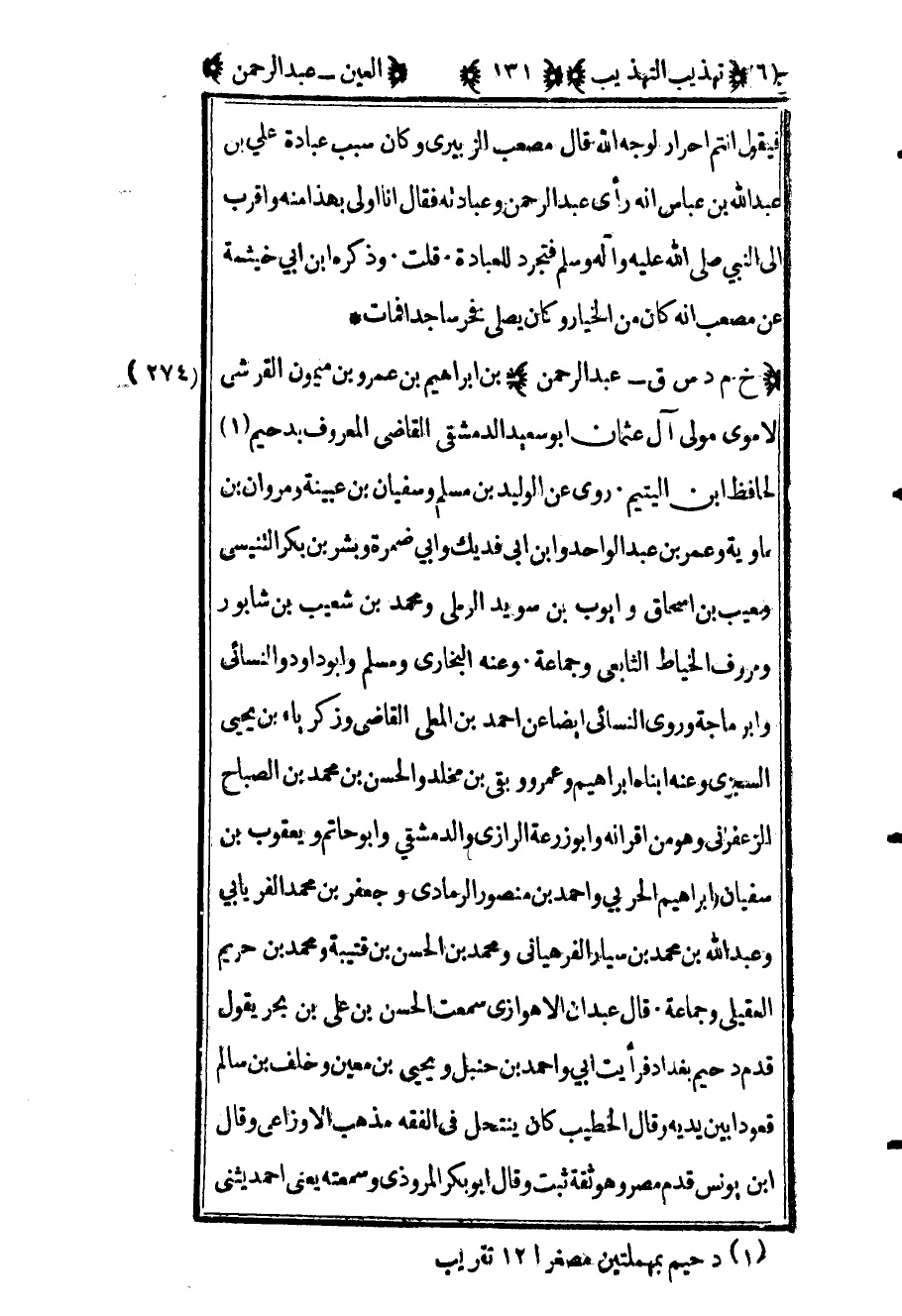 276 - "خ م د س ق عبد الرحمن" بن إبراهيم بن عمرو بن ميمون القرشي الأموي مولى آل عثمان أبو سعيد الدمشقي القاضي المعروف بدحيم1 الحافظ بن اليتيم روى عن الوليد بن مسلم وسفيان بن عيينة ومروان بن ماوية وعمر بن عبد الواحد وابن أبي فديك وأبي ضمرة وبشر بن بكر التنيسي وحبيب بن إسحاق وأيوب بن سويد الرملي ومحمد بن شعيب بن شابور ورؤوف الخياط التابعي وجماعة وعنه البخاري ومسلم وأبو داود والنسائي وابن ماجة وروى النسائي أيضا عن أحمد بن المعلى القاضي وزكرياء بن يحيى السجزي وعنه أبناه إبراهيم وعمرو وبقي بن مخلد والحسن بن محمد بن الصباح الزعفراني وهو من أقرانه وأبو زرعة الرازي والدمشقي وأبو حاتم ويعقوب بن سفيان وإبراهيم الحربي وأحمد بن منصور الرمادي وجعفر بن محمد الفريابي وعبد الله بن محمد بن يسار الفرهياني ومحمد بن الحسن بن قتيبة ومحمد بن حريم العقيلي وجماعة قال عبدان الأهوازي سمعت الحسن بن علي بن بحر يقول قدم دحيم بغداد فرأيت أبي وأحمد بن حنبل ويحيى بن معين وخلف بن سالم قعودا بين يديه وقال الخطيب كان ينتحل في الفقه مذهب الأوزاعي وقال ابن يونس قدم مصر وهو ثقة ثبت وقال أبو بكر المروذي وسمعته يعني أحمد يثني