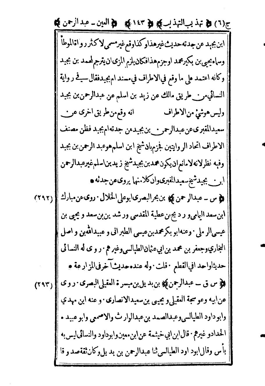 294 - "س عبد الرحمن" بن بحر البصري أبو علي الخلال روى عن مبارك بن سعد اليمامي ورديح بن عطية المقدسي ورشدين بن سعد ويحيى بن عيسى الرملي وعنه أبو بكر محمد بن عيسى الطبراني وعبيد الله بن واصل البخاري وجعفر بن محمد بن أبي عثمان الطيالسي وغيرهم روى له النسائي حديثا واحدا في القطع قلت وله عنده حديث آخر في المزارعة.
