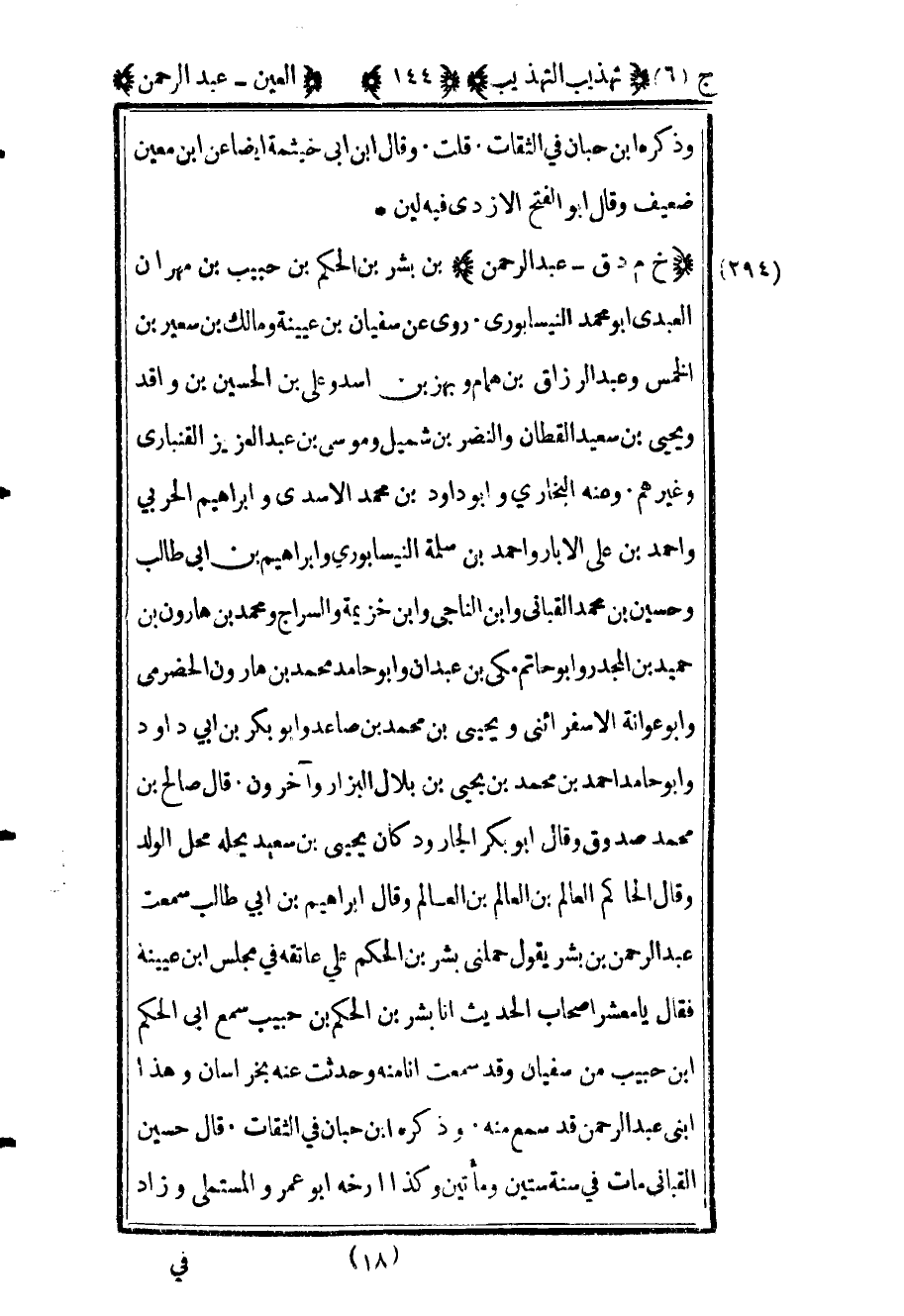 296 - "خ م د ق عبد الرحمن" بن بشر بن الحكم بن حبيب بن مهران العبدي أبو محمد النيسابوري روى عن سفيان بن عيينة ومالك بن سعير بن الخمس وعبد الرزاق بن همام وبهز بن أسد وعلي بن الحسين بن واقد ويحيى بن سعيد القطان والنضر بن شميل وموسى بن عبد العزيز القنباري وغيرهم وعنه البخاري وأبو داود بن محمد الأسدي وإبراهيم الحربي وأحمد بن علي الأبار وأحمد بن سلمة النيسابوري وإبراهيم بن أبي طالب وحسين بن محمد القباني وابن الناجي وابن خزيمة والسراج ومحمد بن هارون بن حميد بن المجدر وأبو حاتم مكي بن عبدان وأبو حامد محمد بن هارون الحضرمي وأبو عوانة الإسفرائيني ويحيى بن محمد بن صاعد وأبو بكر بن أبي داود وأبو حامد أحمد بن محمد بن يحيى بن بلال البزار وآخرون قال صالح بن محمد صدوق وقال أبو بكر الجارود كان يحيى كان يحيى بن سعيد يحله محل الولد وقال الحاكم العالم بن العالم ابن العالم وقال إبراهيم بن أبي طالب سمعت عبد الرحمن بن بشر يقول حملني بشر بن الحكم على عاتقه في مجلس بن عيينة فقال يا معشر أصحاب الحديث أنا بشر بن الحكم بن حبيب سمع أبي الحكم بن حبيب من سفيان وقد سمعت أنا منه وحدثت عنه بخراسان وهذا ابني عبد الرحمن قد سمع منه وذكره ابن حبان في الثقات قال حسين القباني مات في سنة ستين ومائتين وكذا أرخه أبو عمرو المستملى وزاد