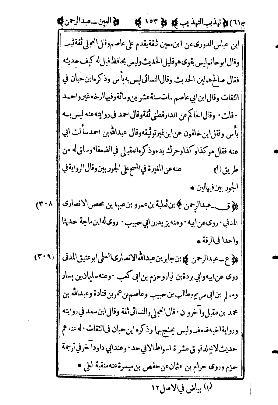 311 - "ع عبد الرحمن" بن جابر بن عبد الله الأنصاري السلمي أبو عتيق المدني روى عن أبيه وأبي بردة بن نيار وحزم بن أبي كعب وعنه سليمان بن يسار ومسلم بن أبي مريم وطالب بن حبيب وعاصم بن عمر بن قتادة وعبد الله بن محمد بن عقيل وآخرون قال العجلي والنسائي ثقة وقال ابن سعد في روايته ورواية أخيه ضعف وليس يحتج بهما وذكره ابن حبان في الثقات له عندهم حديث لا يجلد فوق عشرة أسواط إلا في حد وعند أبي داود آخر في ترجمة حزم وروى حرام بن عثمان عن حفص بن ميسرة عنه منقبة لعلي.