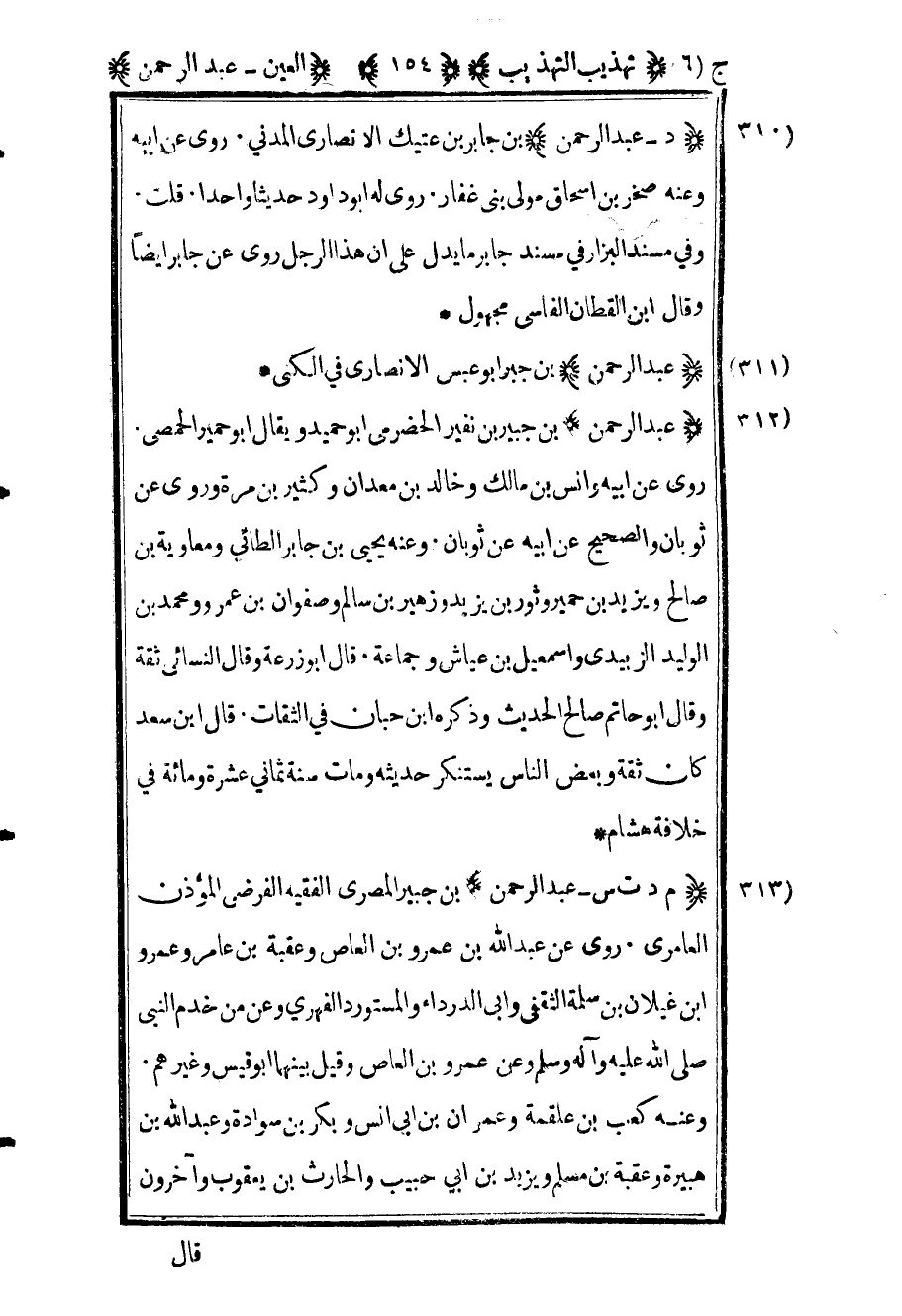 315 - "م د ت س عبد الرحمن" بن جبير المصري الفقيه الفرضي المؤذن العامري روى عن عبد الله بن عمرو بن العاص وعقبة بن عامر وعمرو بن غيلان بن سلمة الثقفي وأبي الدرداء والمستورد الفهري وعن من خدم النبي صلى الله عليه وآله وسلم وعن عمرو بن العاص وقيل بينهما أبو قيس وغيرهم وعنه كعب بن علقمة وعمران بن أبي أنس وبكر بن سوادة وعبد الله ابن هبيرة وعقبة بن مسلم ويزيد بن أبي حبيب والحارث بن يعقوب وآخرون