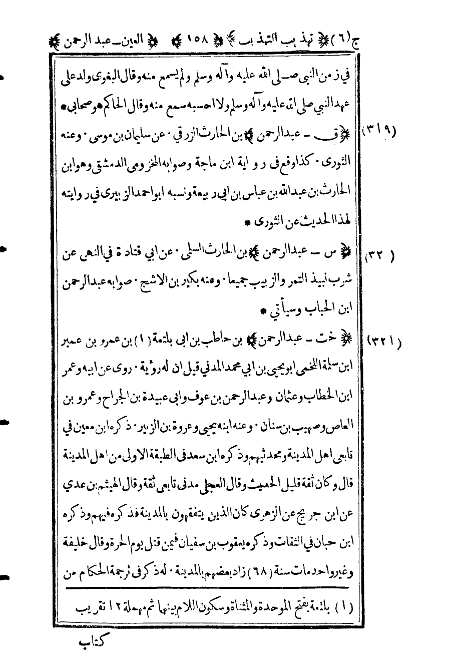 321 - "ق عبد الرحمن" بن الحارث الزرقي عن سليمان بن موسى وعنه الثوري كذا وقع في رواية ابن ماجة وصوابه المخزومي الدمشقي وهو ابن الحارث بن عبد الله بن عباس بن أبي ربيعة ونسبه أبو أحمد الزبيري في روايته لهذا الحديث عن الثوري.