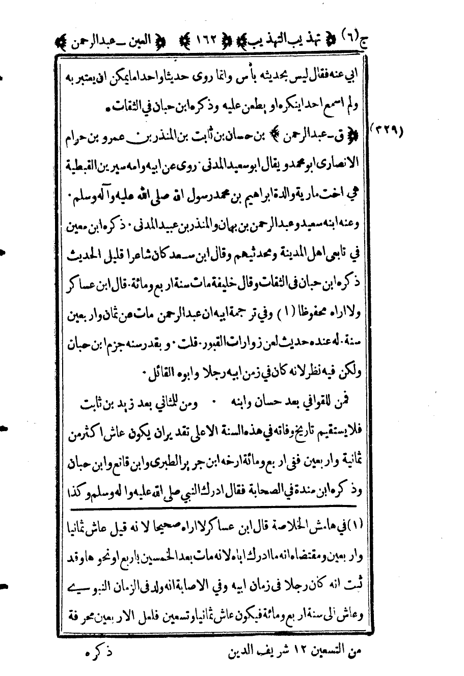 1 في هامش الخلاصة قال ابن عساكر لا أراه صحيحا لأنه قيل عاش ثمانيا وأربعين ومقتضاه أنه ما أدرك أباه لأنه مات بعد الخمسين بأربع أو نحوها وقد ثبت أنه كان رجلا في زمان أبيه وفي الإصابة أنه ولد في الزمان النبوي وعاش إلى سنة أربع ومائة فيكون عاش ثمانيا وتسعين فلعل الأربعين محرفة من التسعين 12 شريف الدين.