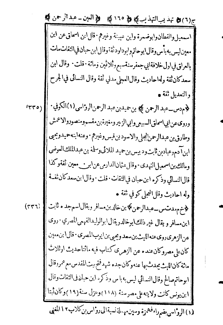338 - "م د س عبد الرحمن" بن حميد بن عبد الرحمن الرؤاسي1 الكوفي وروى عن أبي إسحاق السبيعي وأبي الزبير ومغيرة بن مقسم ومنصور الأعمش وطارق بن عبد الرحمن البجلي والأسود ابن قيس وغيرهم وعنه ابنه حميد ويحيى بن آدم وعباد بن ثابت ودبيس بن حميد الملائي وسلمة ابن عبد الملك العوضي ومالك بن إسماعيل النهدي وقال عثمان الدارمي عن ابن معين ثقة وكذا قال النسائي وذكره ابن حبان في الثقات قلت وقال ابن سعد كان ثقة وله أحاديث وقال العجلي كوفي ثقة.