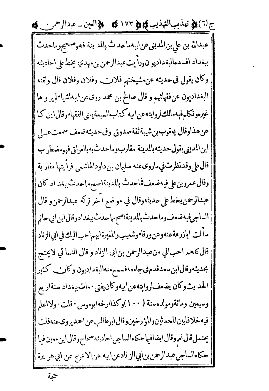عبد الله بن علي بن المديني عن أبيه ما حدث بالمدينة فهو صحيح وما حدث ببغداد أفسده البغداديون ورأيت عبد الرحمن بن مهدي يخط على أحاديثه وكان يقول في حديثه عن مشيختهم فلان وفلان وفلان قال ولقنه البغداديون عن فقهائهم وقال صالح بن محمد روى عن أبيه أشياء لم يروها غيره وتكلم فيه مالك لروايته عن أبيه كتاب السبعة يعني الفقهاء وقال أين كنا عن هذا وقال يعقوب بن شيبة ثقة صدوق وفي حديثه ضعف سمعت علي بن المديني يقول حديثه بالمدينة مقارب وما حدث به بالعراق فهو مضطرب قال علي وقد نظرت فيما روى عنه سليمان بن داود الهاشمي فرأيتها مقاربة وقال عمرو بن علي فيه ضعف فيما حدث بالمدينة أصح ما حدث ببغداد كان عبد الرحمن يخط على حديثه وقال في موضع آخر تركه عبد الرحمن وقال الساجي فيه ضعف وما حدث بالمدينة أصح مما حدث ببغداد وقال ابن أبي حاتم سألت أبا زرعة عنه وعن ورقاء وشعيب والمغيرة أيهم أحب إليك في أبي الزناد قال كلهم أحب إلي من عبد الرحمن بن أبي الزناد وقال النسائي لا يحتج بحديثه وقال ابن سعد قدم في جامعه فسمع منه البغداديون وكان كثير الحديث وكان يضعف لروايته عن أبيه وكا يفتي مات ببغداد سنة أربع وسبعين ومائة ومولده سنة "100" وكذا أرخه أبو موسى قلت ولا أعلم فيه خلافا بين المحدثين والمؤرخين وقال أبو طالب عن أحمد يروي عنه قلت يحتمل قال نعم وقال أيضا فيما حكاه الساجي أحاديثه صحاح وقال ابن معين فيما حكاه الساجي عبد الرحمن بن أبي زناد عن أبيه عن الأعرج عن أبي هريرة