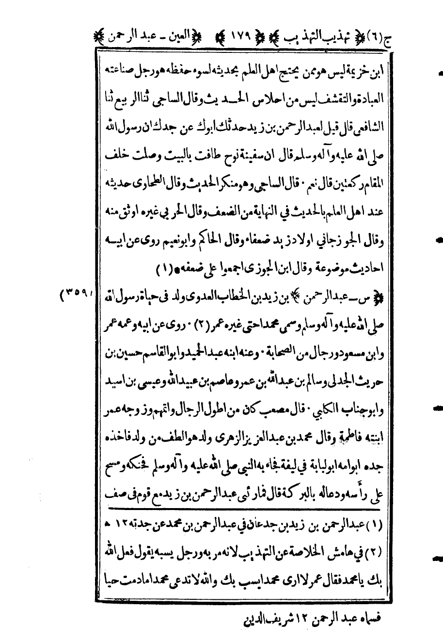 362 - "س عبد الرحمن" بن زيد بن الخطاب العدوي ولد في حياة رسول الله صلى الله عليه وآله وسلم وسمي محمدا حتى غيره عمر2 روى عن أبيه وعمه عمر وابن مسعود ورجال من الصحابة وعنه ابنه عبد الحميد وأبو القاسم حسين بن حريث الجدلي وسالم بن عبد الله بن عمر وعاصم بن عبد الله وعيسى بن أسيد وأبو جناب الكلبي قال مصعب كان من أطول الرجال وأتمهم وزوجة عمر ابنته فاطمة وقال محمد بن عبد العزيز الزهري ولد هو ألطف من ولد فأخذه جده أبو أمه أبو لبابة في ليفة فجاء به النبي صلى الله عليه وآله وسلم فحنكه ومسح على رأسه ودعا له بالبركة قال فما رئي عبد الرحمن بن زيد مع قوم في صف
