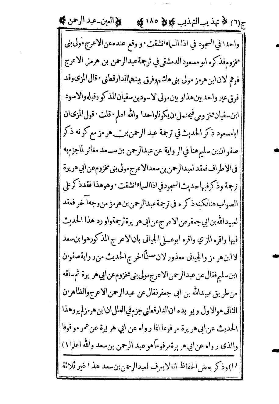 واحدا في السجود في إذا السماء انشقت ووقع عنده عند الأعرج مولى بني مخزوم فذكره أبو مسعود الدمشقي في ترجمة عبد الرحمن بن هرمز الأعرج فوهم لأن ابن هرمز مولى بني هاشم وفرق بينهما الدارقطني قال المزي وقد فرق غير واحد بين هذا وبين مولى الأسود بن سفيان المذكور قبله والأسود بن سفيان مخزومي فيحتمل أن يكونا واحدا والله أعلم قلت قول المزي أن أبا مسعود ذكر الحديث في ترجمة عبد الرحمن بن هرمز مع كونه ذكر صفوان بن سليم هنا في الرواية عن عبد الرحمن بن سعد مغائر لما جزم به في الأطراف فعقد لعبد الرحمن بن سعد الأعرج مولى بني مخزوم عن أبي هريرة ترجمة وذكر فيها حديث السجود في إذا السماء انشقت وهو هذا فقد ذكر على الصواب هنا لكنه ذكره في ترجمة عبد الرحمن بن هرمز من وجه آخر فعقد لعبيد الله بن أبي جعفر عن الأعرج عن أبي هريرة ترجمة وأورد هذا الحديث فيها وأقره المزي وأقره أبو علي الجياني بأن الأعرج المذكور هو ابن سعد لا بن هرمز والجياني معذور لأن مسلما أخرج الحديث من رواية صفوان بن سليم فقال عن عبد الرحمن الأعرج مولى بني مخزوم عن أبي هريرة ثم ساقه من طريق عبيد الله بن أبي جعفر فقال عن عبد الرحمن الأعرج والظاهر أن الثاني هو الأول ويؤيده أن الدارقطني جزم في العلل أن ابن هرمز لم يرو هذا الحديث عن أبي هريرة مرفوعا إنما رواه عن أبي هريرة عن عمر موقوفا والذي رواه عن أبي هريرة مرفوعا هو عبد الرحمن بن سعد والله أعلم1.