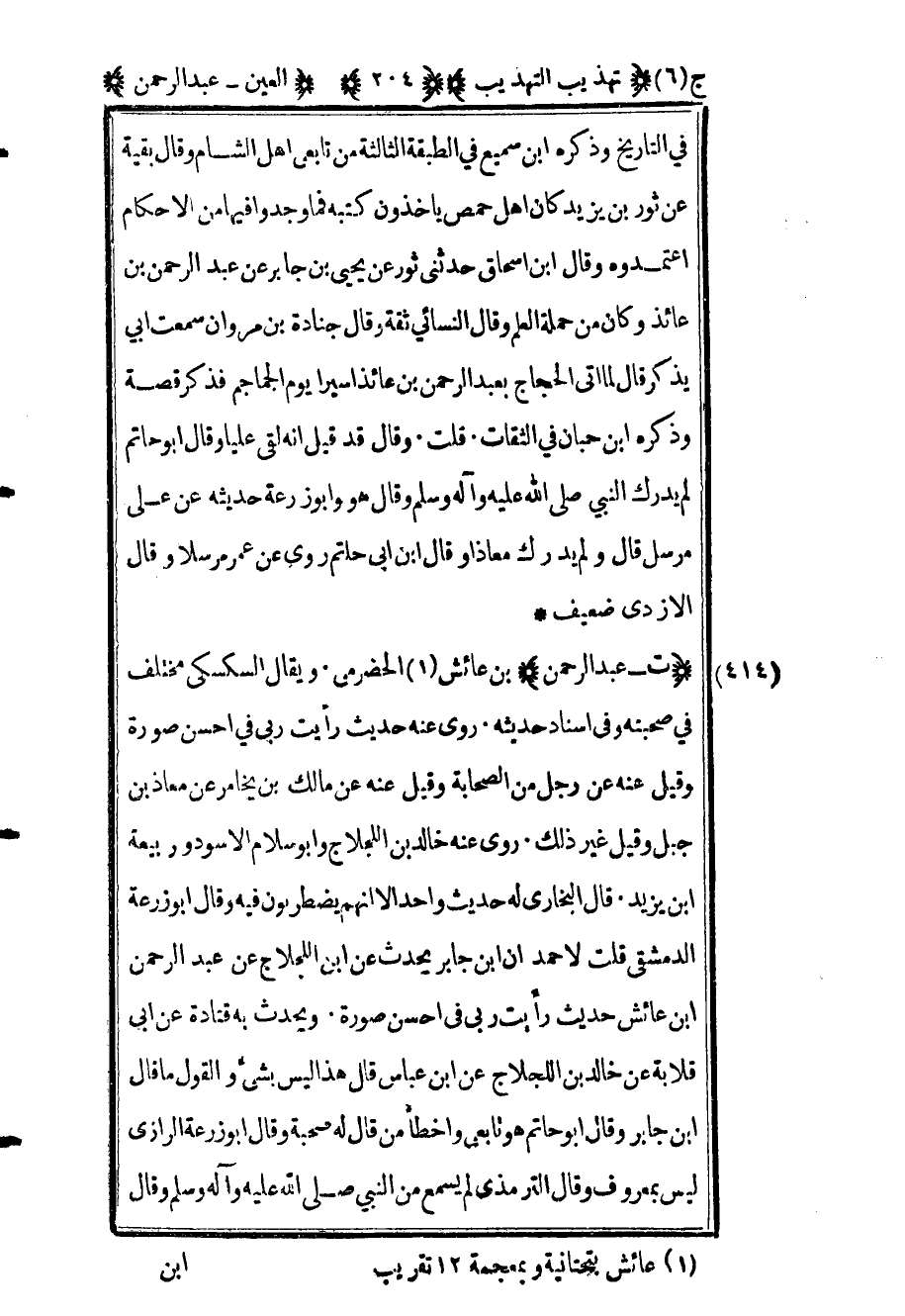 417 - "ت عبد الرحمن" بن عائش1 الحضرمي ويقال السكسكي مختلف في صحبته وفي إسناد حديثه روى عن حديث رأيت ربي في أحسن صورة وقيل عنه عن رجل من الصحابة وقيل عنه عن مالك بن يخامر عن معاذ بن جبل وقيل غير ذلك روى عنه خالد بن اللجلاج وأبو سلام الأسود وربيعة بن يزيد قال البخاري له حديث واحد إلا أنهم يضطربون فيه وقال أبو زرعة الدمشقي قلت لأحمد أن ابن جابر يحدث عن ابن اللجلاج عن عبد الرحمن بن عائش حديث رأيت ربي في أحسن صورة ويحدث به قتادة عن أبي قلابة عن خالد بن اللجلاج عن ابن عباس قال هذا ليس بشيء والقول ما قال ابن جابر وقال أبو حاتم هو تابعي وأخطأ من قال له صحبة وقال أبو زرعة الرازي ليس بمعروف وقال الترمذي لم يسمع من النبي صلى الله عليه وآله وسلم وقال