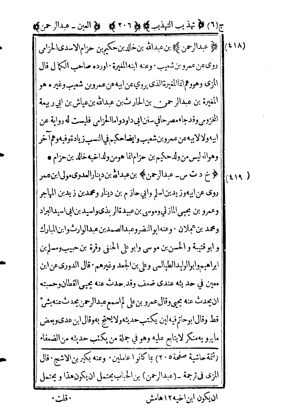 421 - "عبد الرحمن" بن عبد الله بن خالد بن حكيم بن حزام الأسدي الحزامي روى عن عمرو بن شعيب وعنه ابنه المغيرة أورده صاحب الكمال قال المزي وهو وهم إنما المغيرة الذي يروي عن أبيه عن عمرو بن شعيب وغيره هو المغيرة بن عبد الرحمن بن الحارث بن عبد الله بن عياش بن أبي ربيعة المخزومي وقد جاء مصرحا في سنن أبي داود وأما الحزامي فليست له رواية عن أبيه ولا لأبيه عن عمرو بن شعيب وأيضا حكيم في النسب زيادة وفيه وهم آخر وهو أنه ليس من ولد حكيم بن حزام إنما هو من ولد أخيه خالد بن حزام.