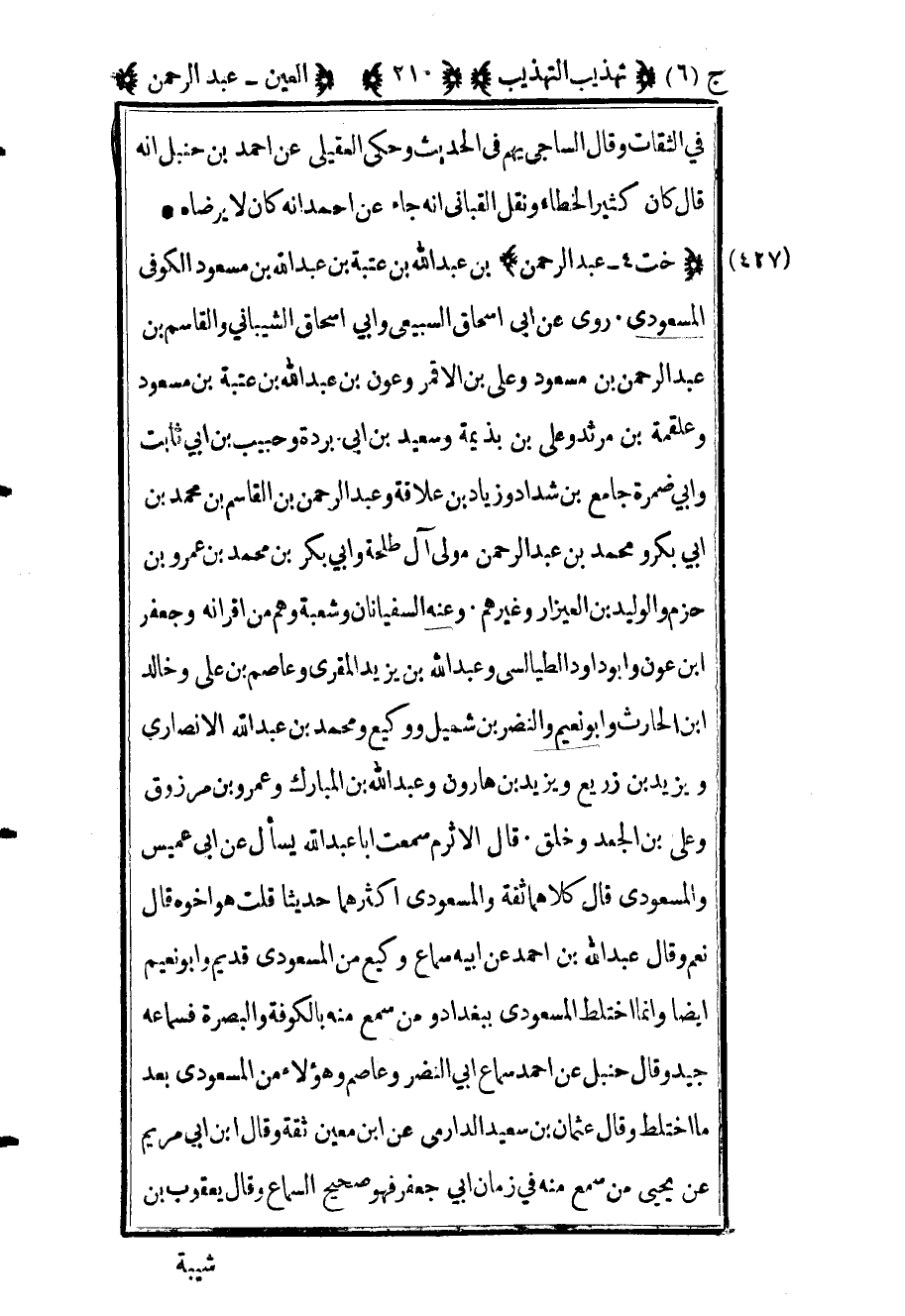 430 - "خت 4 عبد الرحمن" بن عبد الله بن عتبة بن عبد الله بن مسعود الكوفي المسعودي روى عن أبي إسحاق السبيعي وأبي إسحاق الشيباني والقاسم بن عبد الرحمن بن مسعود وعلي ابن الأقمر وعون بن عبد الله بن عتبة بن مسعود وعلقمة بن مرثد وعلي بن بذيمة وسعيد بن أبي بردة وحبيب بن أبي ثابت وأبي ضمرة جامع بن شداد وزياد بن علاقة وعبد الرحمن بن القاسم ابن محمد بن أبي بكر ومحمد بن عبد الرحمن مولى آل طلحة وأبي بكر بن محمد بن عمرو بن حزم والوليد بن العيزار وغيرهم وعنه السفيانان وشعبة وهم من أقرانه وجعفر بن عون وأبو داود الطيالسي وعبد الله بن يزيد المقري وعاصم بن علي وخالد بن الحارث وأبو نعيم والنضر ابن شميل ووكيع ومحمد بن عبد الله الأنصاري ويزيد بن زريع ويزيد بن هارون وعبد الله بن المبارك وعمرو بن مرزوق وعلي بن الجعد وخلق قال الأثرم سمعت أبا عبد الله يسأل عن أبي عميس والمسعودي قال كلاهما ثقة والمسعودي أكثرهما حديثا قلت هو أخوه قال نعم وقال عبد الله بن أحمد عن أبيه سماع وكيع من المسعودي قديم وأبو نعيم أيضا وإنما اختلط المسعودي ببغداد ومن سمع منه بالكوفة والبصرة فسماعه جيد وقال حنبل عن أحمد سماع أبي النضر وعاصم وهؤلاء من المسعودي بعدما اختلط وقال عثمان بن سعيد الدارمي عن ابن معين ثقة وقال ابن أبي مريم عن يحيى من سمع منه في زمان أبي جعفر فهو صحيح السماع وقال يعقوب ابن