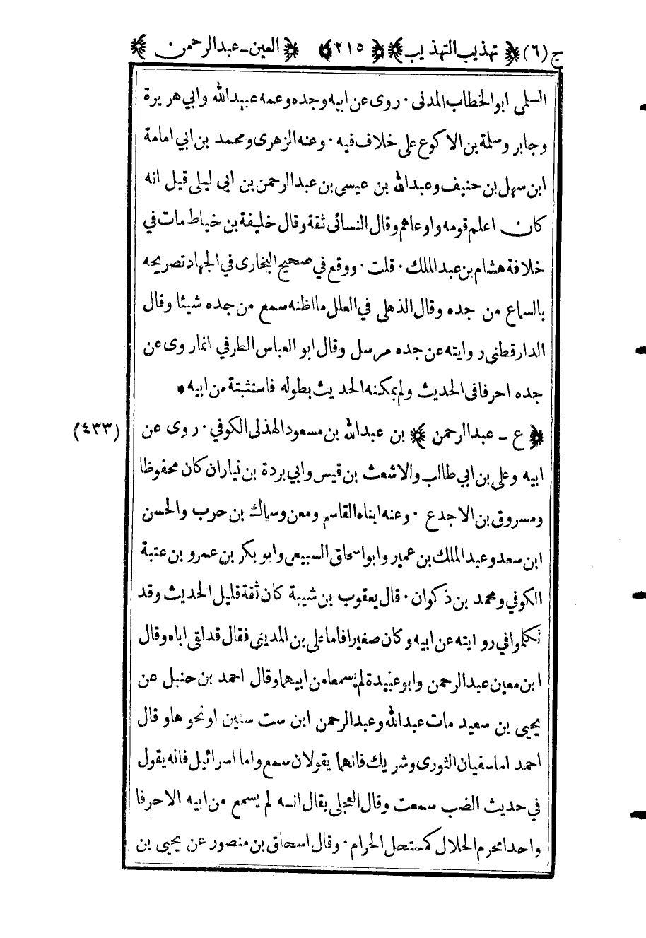 436 - "ع عبد الرحمن" بن عبد الله بن مسعود الهذلي الكوفي روى عن أبيه وعلي بن أبي طالب والأشعث بن قيس وأبي بردة بن نيار إن كان محفوظا ومسروق بن الأجدع وعنه أبناه القاسم ومعن وسماك بن حرب والحسن بن سعد وعبد الملك بن عمير وأبو إسحاق السبيعي وأبو بكر بن عمرو بن عتبة الكوفي ومحمد بن ذكوان قال يعقوب بن شيبة كان ثقة قليل الحديث وقد تكلموا في روايته عن أبيه وكان صغيرا فأما علي بن المديني فقال قد لقي أباه وقال ابن معين عبد الرحمن وأبو عبيدة لم يسمعا من أبيهما وقال أحمد بن حنبل عن يحيى بن سعيد مات عبد الله وعبد الرحمن بن ست سنين أو نحوها وقال أحمد أما سفيان الثوري وشريك فإنهما يقول لان سمع وأما إسرائيل فإنه يقول في حديث الضب سمعت وقال العجلي يقال إنه لم يسمع من أبيه الا حرفا واحدا محرم الحلال كمستحل الحرام وقال إسحاق بن منصور عن يحيى بن
