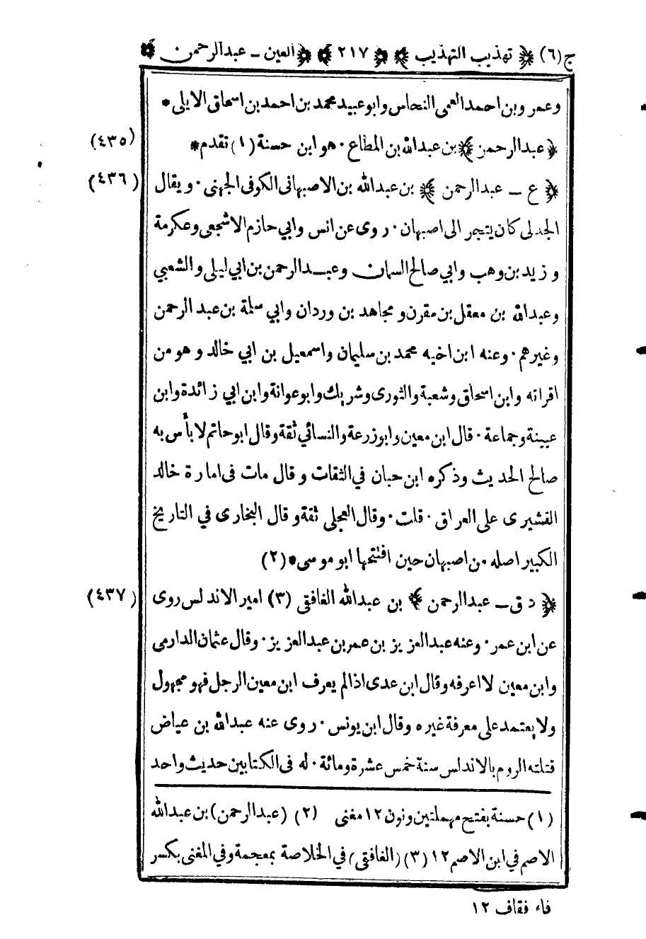 439 - "ع عبد الرحمن" بن عبد الله بن الأصبهاني الكوفي الجهني ويقال الجدلي كان يتجر إلى أصبهان روى عن أنس وأبي حازم الأشجعي وعكرمة وزيد بن وهب وأبي صالح السمان وعبد الرحمن بن أبي ليلى والشعبي وعبد الله بن معقل بن مقرن ومجاهد بن وردان وأبي سلمة بن عبد الرحمن وغيرهم وعنه ابن أخيه محمد بن سليمان وإسماعيل بن أبي خالد وهو من أقرانه وابن إسحاق وشعبة والثوري وشريك وأبو عوانة وابن أبي زائدة وابن عيينة وجماعة قال ابن معين وأبو زرعة والنسائي ثقة وقال أبو حاتم لا بأس به صالح الحديث وذكره ابن حبان في الثقات وقال مات في إمارة خالد القشيري على العراق قلت وقال العجلي ثقة وقال البخاري في التاريخ الكبير أصله من أصبهان حين افتتحها أبو موسى.2