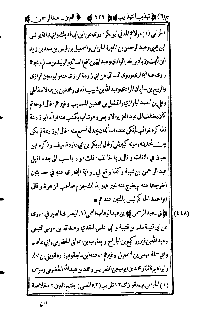 451 - "ق عبد الرحمن" بن عبد الوهاب العمى2 البصري الصيرفي روى عن أبي قتيبة سلم بن قتيبة وأبي عامر العقدي وعبد الله بن موسى التيمي وعبد الله بن نمير ووكيع بن الجراح ويعقوب ابن إسحاق الحضرمي وأبي عاصم وأبي سلمة موسى بن إسماعيل وغيرهم وعنه ابن ماجة وأبو زرعة وبقي بن مخلد وإبراهيم نائلة ومحمد بن أيوب بن الضريس ومحمد بن عبد الله الحضرمي وموسى