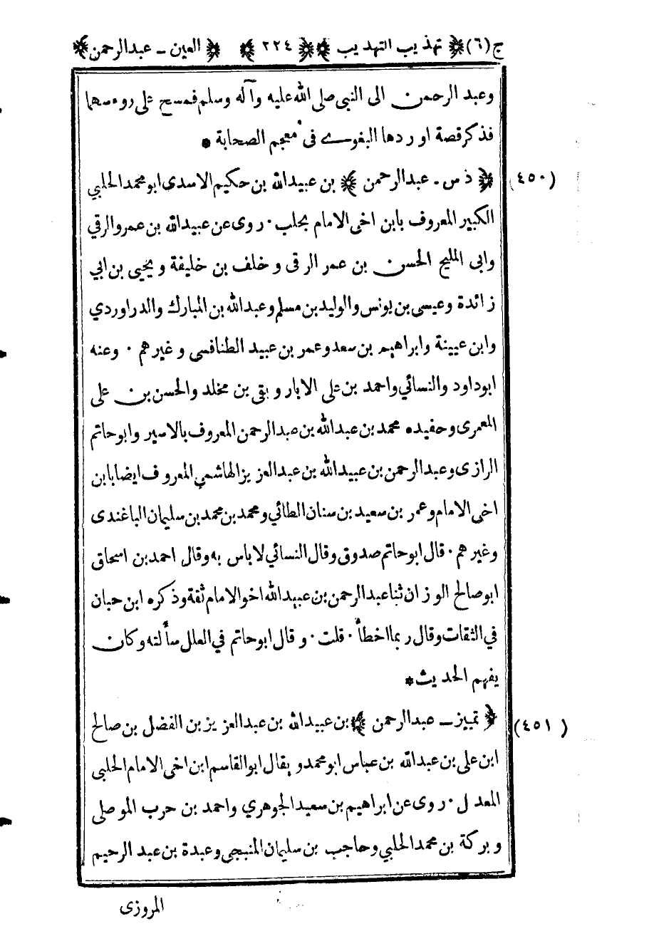 454 - "تمييز عبد الرحمن" بن عبيد الله بن عبد العزيز بن الفضل بن صالح بن علي بن عبد الله ابن عباس أبو محمد ويقال أبو القاسم بن أخي الإمام الحلبي المعدل روى عن إبراهيم بن سعيد الجوهري وأحمد بن حرب الموصلي وبركة بن محمد الحلبي وحاجب بن سليمان المنبجي وعبدة ابن عبد الرحيم