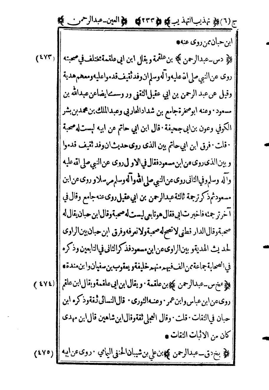 476 - "د س عبد الرحمن" بن علقمة ويقال ابن أبي علقمة مختلف في صحبته روى عن النبي صلى الله عليه وآله وسلم أن وفد ثقيف قدموا عليه ومعهم هدية وقيل عن عبد الرحمن بن أبي عقيل الثقفي وروى أيضا عن عبد الله بن مسعود وعنه أبو صخرة جامع بن شداد المحاربي وعبد الملك بن محمد بن بشر الكوفي وعون بن أبي جحيفة قال ابن أبي حاتم عن أبيه ليست له صحبة قلت فرق بن أبي حاتم بين الذي روى حديث أن وفد ثقيف قدموا وبين الذي روى عن ابن مسعود فقال في الأول روى عن النبي صلى الله عليه وآله وسلم وفي الثاني روى عن النبي صلى الله عليه وآله وسلم مرسلا وروى عن ابن مسعود ثم ذكر ترجمة ثالثة عبد الرحمن بن أبي عقيل روى عنه جامع وقال في آخر ترجمته فأخبرت أبي فقال هو تابعي ليست له صحبة وقال ابن حبان يقال له صحبة وقال الدارقطني لا تصح له صحبة ولا نعرفه وفرق بن حبان بين الراوي لحديث الهدية وبين الراوي عن ابن مسعود فذكر الثاني في التابعين وذكره في الصحابة جماعة ممن ألف فيهم منهم خليفة ويعقوب بن سفيان وابن مندة.