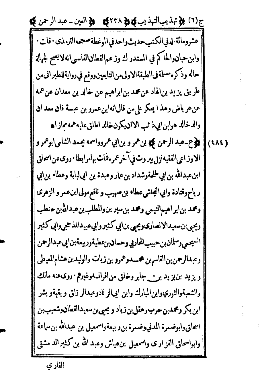 487 - "ع عبد الرحمن" بن عمرو بن أبي عمرو واسمه يحمد الشامي أبو عمرو الأوزاعي الفقيه نزل بيروت في آخر عمره فمات بها مرابطا روى عن إسحاق بن عبد الله بن أبي طلحة وشداد ابن عمار وعبدة بن أبي لبابة وعطاء بن أبي رباح وقتادة وأبي النجاشي عطاء بن صهيب ونافع مولى بن عمر والزهري ومحمد بن إبراهيم التيمي ومحمد بن سيرين والمطلب بن عبد الله بن حنطب ويحيى بن سعيد الأنصاري ويحيى بن أبي كثير وأبي عبيد المذحجي وأبي كثير السيحمي وسلمان بن حبيب المحاربي وحسان بن عطية وربيعة بن أبي عبد الرحمن وعبد الرحمن بن القاسم ابن محمد وعمرو بن زيات والوليد بن هشام المعيطي ويزيد بن يزيد بن جابر وخلق من أقرانه وغيرهم روى عنه مالك والشعبة والثوري وابن مبارك وابن أبي الزناد وعبد الرزاق وبقية وبشر ابن بكر ومحمد بن حرب وهقل بن زياد ويحيى بن سعيد القطان وشعيب بن إسحاق وأبو ضمرة المدني وضمرة بن ربيعة وإسماعيل بن عبد الله بن سماعه وأبو إسحاق الفزاري وإسماعيل ابن عياش وعبد الله بن كثير الدمشقي