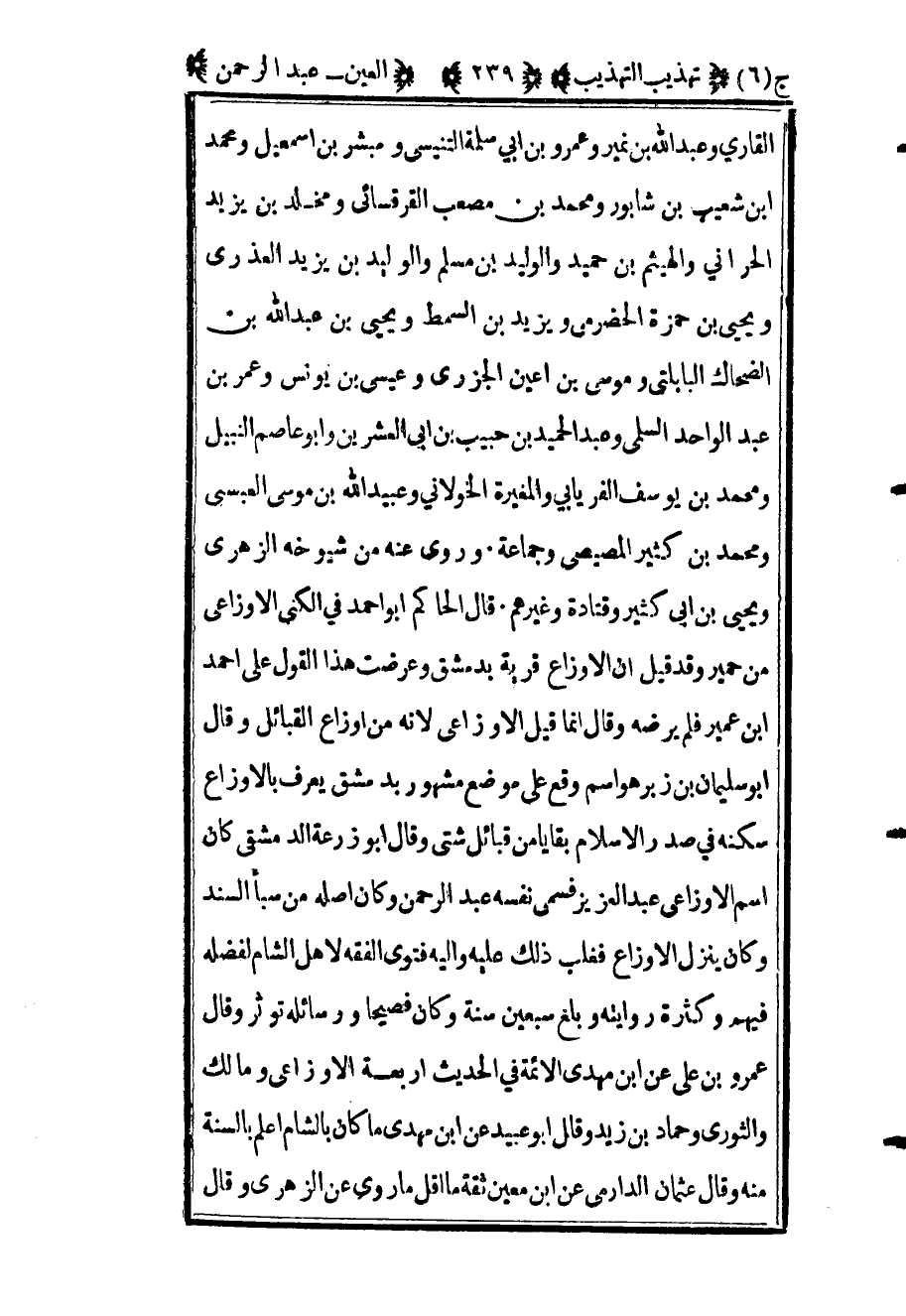 القاري وعبد الله بن نمير وعمرو بن أبي سلمة التنيسي ومبشر بن إسماعيل ومحمد بن شعيب بن شابور ومحمد بن مصعب القرقسائي ومخلد بن يزيد الحراني والهيثم بن حميد والوليد بن مسلم والوليد بن يزيد العذري ويحيى بن حمزة الحضرمي ويزيد بن السمط ويحيى بن عبد الله بن ال 0ضحاك البابلتي وموسى بن أعين الجزري وعيسى بن يونس وعمر بن عبد الواحد السلمي وعبد الحميد بن حبيب بن أبي العشرين وأبو عاصم النبيل ومحمد بن يوسف الفريابي والمغيرة الخولاني وعبيد الله بن موسى العبسي ومحمد بن كثير المصيصي وجماعة وروى عنه من شيوخه الزهري ويحيى بن أبي كثير وقتادة وغيرهم قال الحاكم أبو أحمد في الكنى الأوزاعي من حمير وقد قيل أن الأوزاع قرية بدمشق وعرضت هذا القول على أحمد بن عمير فلم يرضه وقال إنما قيل الأوزاعي لأنه من أوزاع القبائل وقال أبو سليمان بن زبر هو اسم وقع على موضع مشهور بدمشق يعرف بالأوزاع سكنه في صدر الإسلام بقايا من قبائل شتى وقال أبو زرعة الدمشقي كان اسم الأوزاعي عبد العزيز فسمى نفسه عبد الرحمن وكان أصله من سبأ السند وكان ينزل الاوزاع فغلب ذلك عليه وإليه فتوى الفقه لأهل الشام لفضله فيهم وكثرة روايته وبلغ سبعين سنة وكان فصيحا ورسائله تؤثر وقال عمرو بن علي عن ابن مهدي الأئمة في الحديث أربعة الأوزاعي ومالك والثوري وحماد بن زيد وقال أبو عبيد عن ابن مهدي ما كان بالشام أعلم بالسنة منه وقال عثمان الدارمي عن ابن معين ثقة ما أقل ما روى عن الزهري وقال