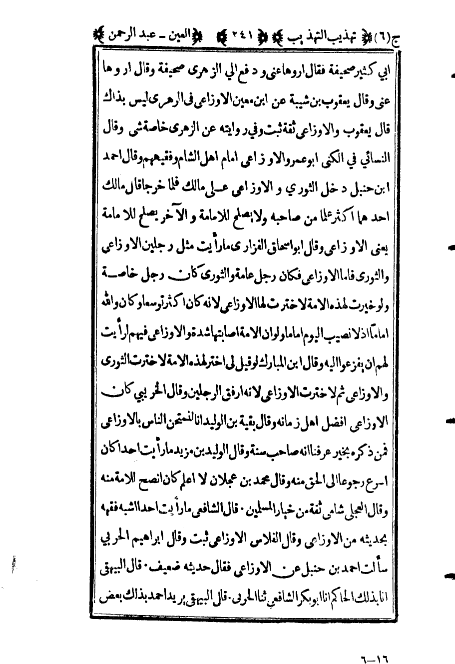 أبي كثير صحيفة فقال اروها عني ودفع إلى الزهري صحيفة وقال اروها عني وقال يعقوب بن شيبة عن ابن معين الأوزاعي في الزهري ليس بذاك قال يعقوب والأوزاعي ثقة ثبت في روايته عن الزهري خاصة شيء وقال النسائي في الكنى أبو عمرو والأوزاعي أما أهل الشام وفقيههم وقال أحمد بن حنبل دخل الثوري والأوزاعي على مالك فلما خرجا قال مالك أحدهما أكثر علما من صاحبه ولا يصلح للإمامة والآخر يصلح للإمامة يعني الأوزاعي وقال أبو إسحاق الفزاري ما رأيت مثل رجلين الأوزاعي والثوري فأما الأوزاعي فكان رجل عامة والثوري كان رجل خاصة ولو خيرت لهذه الأمة لاخترت لها الأوزاعي لأنه كان أكثر توسعا وكان والله إماما إذ لا نصيب اليوم إماما ولو أن الأمة اصابتها شدة والأوزاعي فيهم لرأيت له أن يفزعوا إليه وقال ابن مبارك لو قيل لي اختر لهذه الأمة لاخترت الثوري والأوزاعي ثم لاخترت الأوزاعي لأنه أرفق الرجلين وقال الخريبي كان الأوزاعي أفضل أهل زمانه وقال بقية بن الوليد إنا لنمتحن الناس بالاوزاعي فمن ذكره بخير عرفنا أنه صاحب سنة وقال الوليد بن مزيد ما رأيت أحدا كان أسرع رجوعا إلى الحق منه وقال محمد بن عجلان لا أعلم كان أنصح للأمة منه وقال العجلي شامي ثقة من خيار المسلمين قال الشافعي ما رأيت أحدا أشبه فقهه بحديثه من الأوزاعي وقال الفلاس الأوزاعي ثبت وقال إبراهيم الحربي سألت أحمد بن حنبل عن الأوزاعي فقال حديثه ضعيف قال البيهقي أنا بذلك الحاكم أنا أبو بكر الشافعي ثنا الحربي قال البيهقي يريد أحمد بذلك بعض