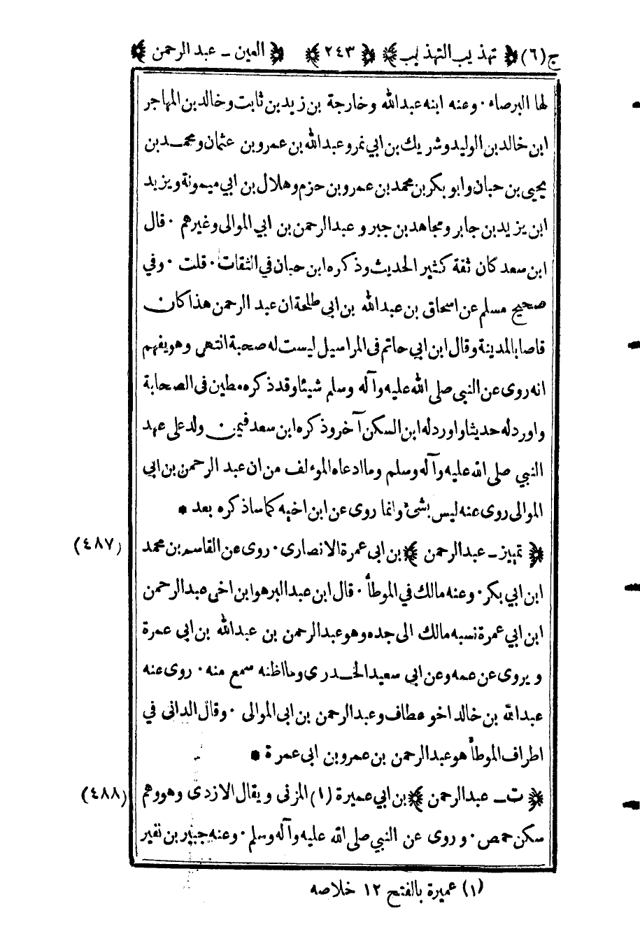 490 - "تمييز عبد الرحمن" بن أبي عمرة الأنصاري روى عن القاسم بن محمد بن أبي بكر وعنه مالك في الموطأ قال ابن عبد البر هو ابن أخي عبد الرحمن بن أبي عمرة نسبه مالك إلى جده وهو عبد الرحمن بن عبد الله بن عمرة ويروي عن عمه وعن أبي سعيد الخدري وما أظنه سمع منه روى عنه عبد الله بن خالد أخو عطاف وعبد الرحمن بن أبي الموالي وقال الداني في أطراف الموطأ هو عبد الرحمن بن عمرو بن أبي عمرة.