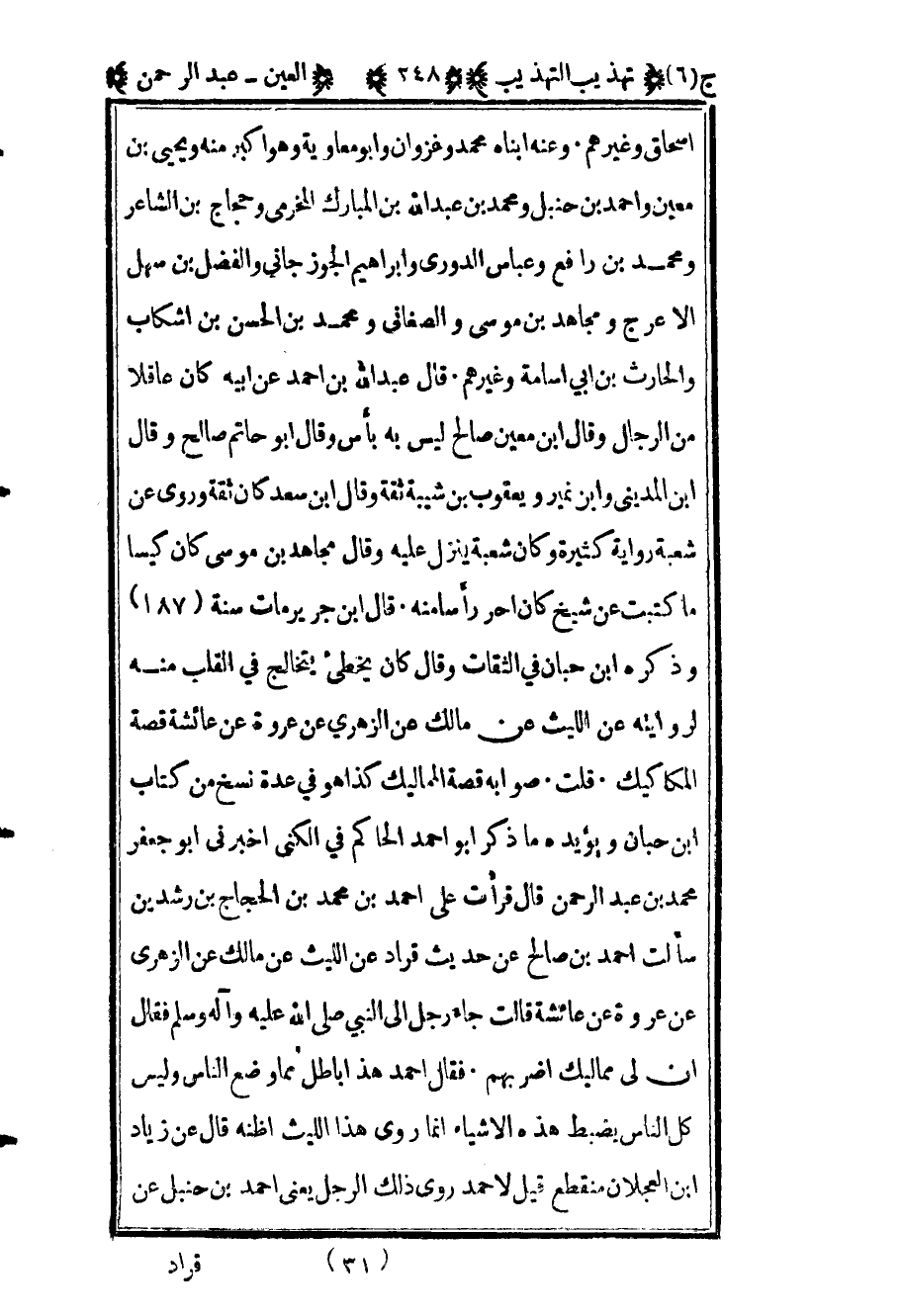 إسحاق وغيرهم وعنه أبناه محمد وغزوان وأبو معاوية وهو أكبر منه ويحيى بن معين وأحمد بن حنبل ومحمد بن عبد الله بن المبارك المخرمي وحجاج بن الشاعر ومحمد بن رافع وعباس الدوري وإبراهيم الجوزجاني والفضل بن سهل الأعرج ومجاهد بن موسى والصغاني ومحمد بن الحسن بن أشكاب والحارث بن أبي أسامة وغيرهم قال عبد الله بن أحمد عن أبيه كان عاقلا من الرجال وقال ابن معين صالح ليس به بأس وقال أبو حاتم صالح وقال ابن المديني وابن نمير ويعقوب بن شيبة ثقة وقال ابن سعد كان ثقة وروى عن شعبة رواية كثيرة وكان شعبة ينزل عليه وقال مجاهد بن موسى كان كيسا ما كتبت عن شيخ كان احر رأسا منه قال ابن جرير مات سنة "187" وذكره ابن حبان في الثقات وقال كان يخطىء يتخالج في القلب منه لروايته عن الليث عن مالك عن الزهري عن عروة عن عائشة قصة المكاكيك قلت صوابه قصة المماليك كذا هو في عدة نسخ من كتاب بن حبان ويؤيده ما ذكر أبو أحمد الحاكم في الكنى أخبرني أبو جعفر محمد بن عبد الرحمن قال قرأت على أحمد بن محمد بن الحجاج بن رشدين سألت أحمد ابن صالح عن حديث قراد عن الليث عن مالك عن الزهري عن عروة عن عائشة قالت جاء رجل إلى النبي صلى الله عليه وآله وسلم فقال إن لي مماليك اضربهم فقال أحمد هذا باطل مما وضع الناس وليس كل الناس يضبط هذه الأشياء إنما روى هذا الليث أظنه قال عن زياد بن عجلان منقطع قيل لأحمد روى ذلك الرجل يعني أحمد بن حنبل عن