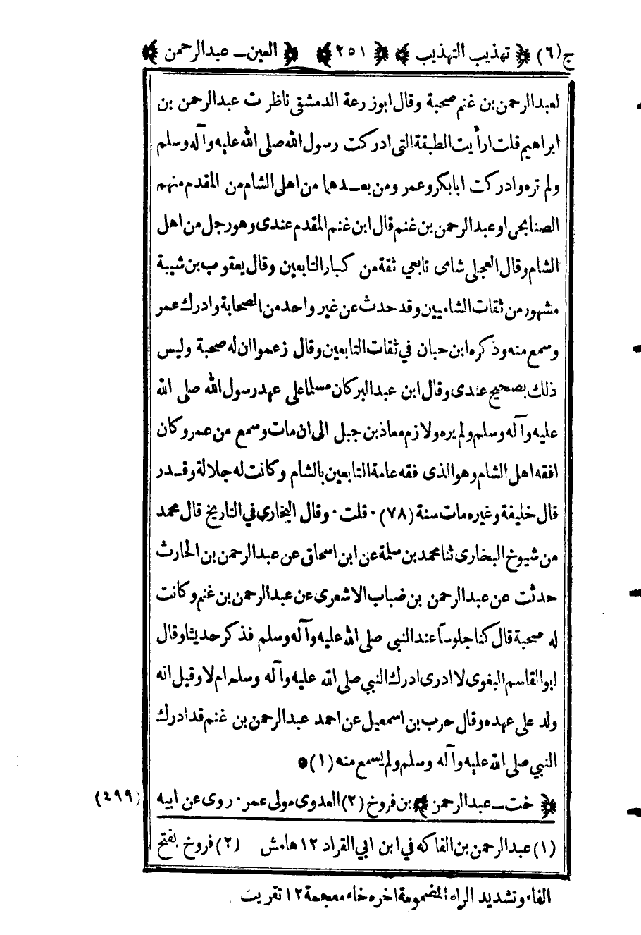 لعبد الرحمن بن غنم صحبة وقال أبو زرعة الدمشقي ناظرت عبد الرحمن بن إبراهيم قلت أرأيت الطبقة التي أدركت رسول الله صلى الله عليه وآله وسلم ولم تره وأدركت أبا بكر وعمر ومن بعدهما من أهل الشام من المقدم منهم الصنابحي أو عبد الرحمن بن غنم قال ابن غنم المقدم عندي وهو رجل من أهل الشام وقال العجلي شامي تابعي ثقة من كبار التابعين وقال يعقوب ابن شيبة مشهور من ثقات الشاميين وقد حدث من غير واحد من الصحابة وأدرك عمر وسمع منه وذكره ابن حبان في الثقات التابعين وقال زعموا أن له صحبة وليس ذلك بصحيح عندي وقال ابن عبد البر كان مسلما على عهد رسول الله صلى الله عليه وآله وسلم ولم يره ولازم معاذ بن جبل إلى أن مات وسمع من عمر وكان أفقه أهل الشام وهو الذي فقه عامة التابعين بالشام وكانت له جلالة وقدر قال خليفة وغيره مات سنة "78" قلت وقال البخاري في التاريخ قال محمد من شيوخ البخاري ثنا محمد بن سلمة عن ابن إسحاق عن عبد الرحمن بن الحارث حدثت عن عبد الرحمن بن ضباب الأشعري عن عبد الرحمن بن غنم وكانت له صحبة قال كنا جلوسا عند النبي صلى الله عليه وآله وسلم فذكر حديثا وقال أبو القاسم البغوي لا أدري أدرك النبي صلى الله عليه وآله وسلم أم لا وقيل إنه ولد على عهده وقال حرب بن إسماعيل عن أحمد عبد الرحمن بن غنم قد أدرك النبي صلى الله عليه وآله وسلم ولم يسمع منه.1