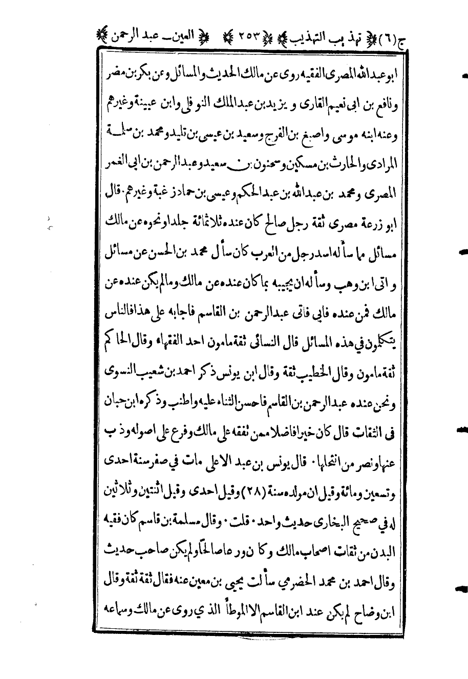 أبو عبد الله المصري الفقيه روى عن مالك الحديث والمسائل وعن بكر بن مضر ونافع بن أبي نعيم القاري ويزيد بن عبد الملك النوفلي وابن عيينة وغيرهم وعنه ابنه موسى وأصبغ بن الفرج وسعيد بن عيسى بن تليد ومحمد بن سلمة المرادي والحارث بن مسكين وسحنون بن سعيد وعبد الرحمن بن أبي الغمر المصري ومحمد بن عبد الله بن عبد الحكم وعيسى بن حماد زغبة وغيرهم قال أبو زرعة مصري ثقة رجل صالح كان عنده ثلاثمائة جلدا ونحوه عن مالك مسائل مما سأله أسد رجل من العرب كان سأل محمد بن الحسن عن مسائل وأتى بن وهب وسأله أن يجيب بما كان عنده عن مالك وما لم يكن عنده عن مالك فمن عنده فأبى فأتى عبد الرحمن بن القاسم فأجابه على هذا فالناس يتكلمون في هذه المسائل قال النسائي ثقة مأمون أحد الفقهاء وقال الحاكم ثقة مأمون وقال الخطيب ثقة وقال ابن يونس ذكر أحمد بن شعيب النسوي ونحن عنده عبد الرحمن بن القاسم فأحسن الثناء عليه وأطنب وذكره ابن حبان في الثقات قال كان خيرا فاضلا ممن تفقه على مالك وفرع على أصوله وذب عنها ونصر من انتحلها قال يونس بن عبد الأعلى مات في صفر سنة إحدى وتسعين ومائة وقيل إن مولده سنة "28" وقيل إحدى وقيل اثنتين وثلاثين له في صحيح البخاري حديثا واحد قلت وقال مسلمة بن قاسم كان فقيه البدن من ثقات أصحاب مالك وكان ورعا صالحا ولم يكن صاحب حديث وقال أحمد بن محمد الحضرمي سألت يحيى بن معين عنه فقال ثقة ثقة وقال ابن وضاح لم يكن عند بن القاسم إلا الموطأ الذي روى عن مالك وسماعه