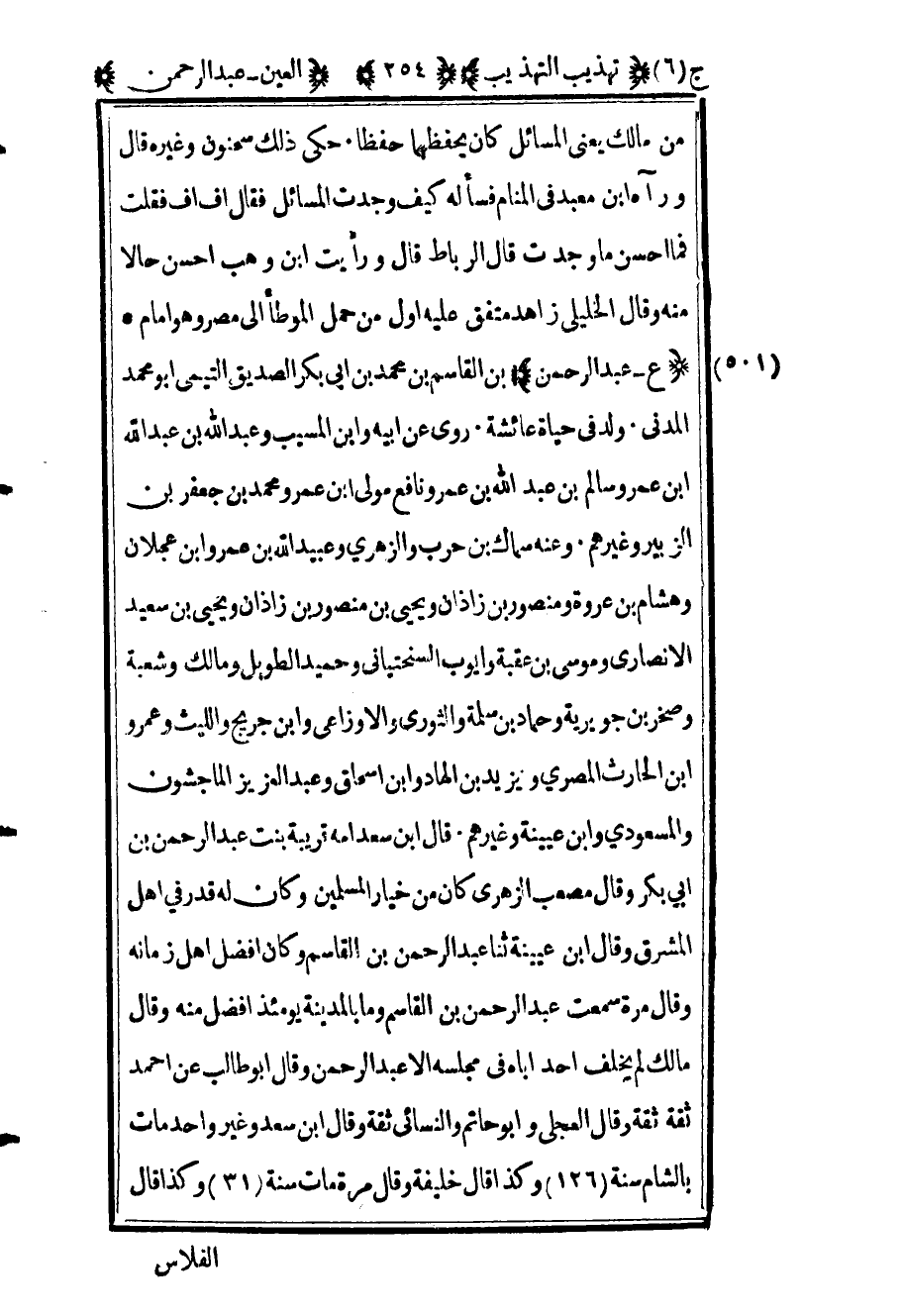 504 - "ع عبد الرحمن" بن القاسم بن محمد بن أبي بكر الصديق التيمي أبو محمد المدني ولد في حياة عائشة روى عن أبيه وابن المسيب وعبد الله بن عبد الله بن عمر وسالم بن عبد الله بن عمر ونافع مولى بن عمر ومحمد بن جعفر بن الزبير وغيرهم وعنه سماك بن حرب والزهري وعبيد الله بن عمر وابن عجلان وهشام بن عروة ومنصور بن زاذان ويحيى بن سعيد الأنصاري وموسى بن عقبة وأيوب السختياني وحميد الطويل ومالك وشعبة وصخر بن جويرية وحماد بن سلمة والثوري والأوزاعي وابن جريج والليث وعمرو بن الحارث المصري ويزيد بن الهاد وابن إسحاق وعبد العزيز الماجشون والمسعودي وابن عيينة وغيرهم قال ابن سعد أمة قريبة بنت عبد الرحمن بن أبي بكر وقال مصعب الزهري كان من خيار المسلمين وكان له قدر في أهل المشرق وقال ابن عيينة ثنا عبد الرحمن بن القاسم وكان أفضل أهل زمانه وقال مرة سمعت عبد الرحمن ابن القاسم وما بالمدينة يومئذ أفضل منه وقال مالك لم يخلف أحد أباه في مجلسه إلا عبد الرحمن وقال أبو طالب عن أحمد ثقة ثقة وقال العجلي وأبو حاتم والنسائي ثقة وقال ابن سعد وغير واحد مات بالشام سنة "126" وكذا قال خليفة وقال مرة مات سنة "31" وكذا قال