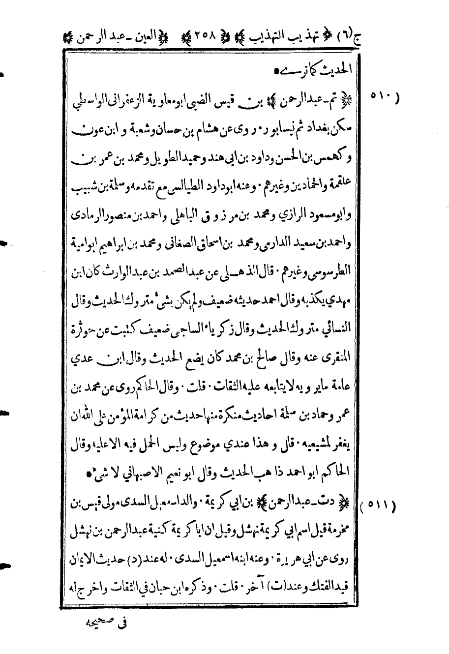 513 - "تم عبد الرحمن" بن قيس الضبي أبو معاوية الزعفراني الواسطي سكن بغداد ثم نيسابوري روى عن هشام بن حسان وشعبة وابن عون وكهمس بن الحسن وداود بن أبي هند وحميد الطويل ومحمد بن عمر بن علقمة والحمادين وغيرهم وعنه أبو داود الطيالسي مع تقدمه وسلمة بن شبيب وأبو مسعود الرازي ومحمد بن مرزوق الباهلي وأحمد بن منصور الرمادي وأحمد بن سعيد الدارمي ومحمد بن إسحاق الصغاني ومحمد بن إبراهيم أبو أمية الطرسوسي وغيرهم قال الذهلي عن عبد الصمد بن عبد الوارث كان ابن مهدي يكذبه وقال أحمد حديثه ضعيف ولم يكن بشيء متروك الحديث وقال النسائي متروك الحديث وقال زكريا الساجي ضعيف كتبت عن حوثرة المنقري عنه وقال صالح بن محمد كان يضع الحديث وقال ابن عدي عامة ما يريويه لا يتابعه عليه الثقات قلت وقال الحاكم روى عن محمد بن عمر وحماد بن سلمة أحاديث منكرة منها حديث من كرامة المؤمن على الله أن يغفر لمشيعيه قال وهذا عندي موضوع وليس الحمل فيه إلا عليه وقال الحاكم أبو أحمد ذاهب الحديث وقال أبو نعيم الأصبهاني لا شيء.