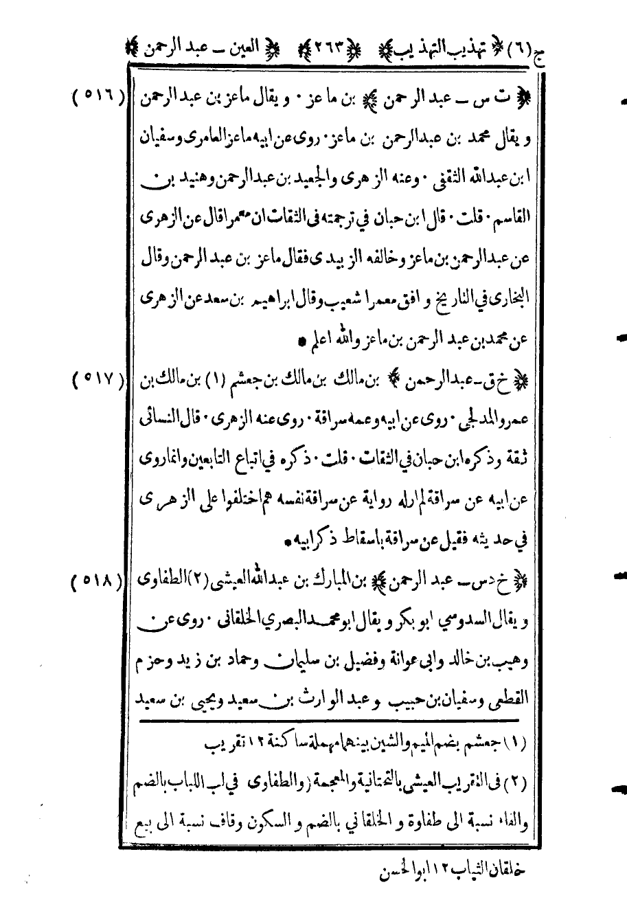 521 - "خ د س عبد الرحمن" بن المبارك بن عبد الله العيشي2 الطفاوي ويقال السدوسي أبو بكر ويقال أبو محمد البصري الخلقاني روى عن وهيب بن خالد وأبي عوانة وفضيل بن سليمان وحماد بن زيد وحزم القطعي وسفيان بن حبيب وعبد الوارث بن سعيد ويحيى بن سعيد
