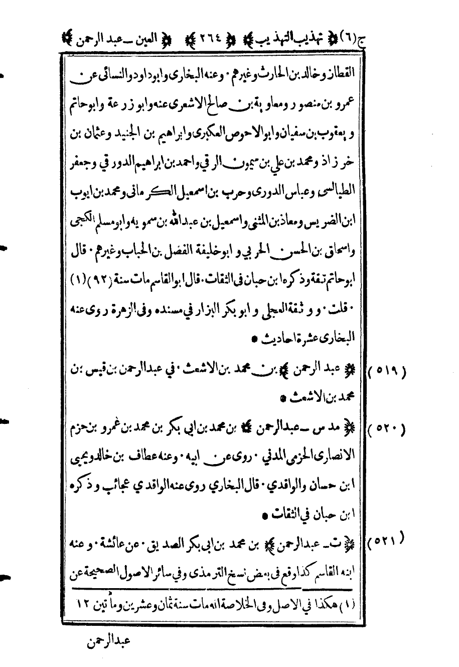 523 - "مد س عبد الرحمن" بن محمد بن أبي بكر بن محمد بن عمرو بن حزم الأنصاري الحزمي المدني روى عن أبيه وعنه عطاف بن خالد ويحيى بن حسان والواقدي قال البخاري روى عنه الواقدي عجائب وذكره ابن حبان في الثقات.