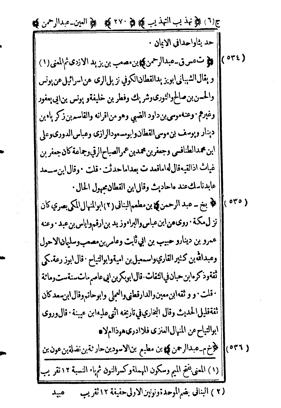 538 - "بخ عبد الرحمن" بن مطعم البناني2 أبو المنهال المكي بصري كان نزل مكة روى عن ابن عباس والبراء وزيد بن أرقم وإياس بن عبد وعنه عمرو بن دينار وحبيب بن أبي ثابت وعامر ابن مصعب وسليمان الأحول وعبد الله بن كثير القاري وإسماعيل بن أمية وأبو التياح قال أبو زرعة مكي ثقة وذكره ابن حبان في الثقات قال أبو بكر بن أبي عاصم مات سنة ست ومائة قلت ووثقه بن معين والدارقطني والعجلي وأبو حاتم وقال ابن سعد كان ثقة قليل الحديث وقال البخاري في تاريخه أثنى عليه بن عيينة قال وروى أبو التياح عن المنهال العنزي فلا أدري هو ذا أم لا.
