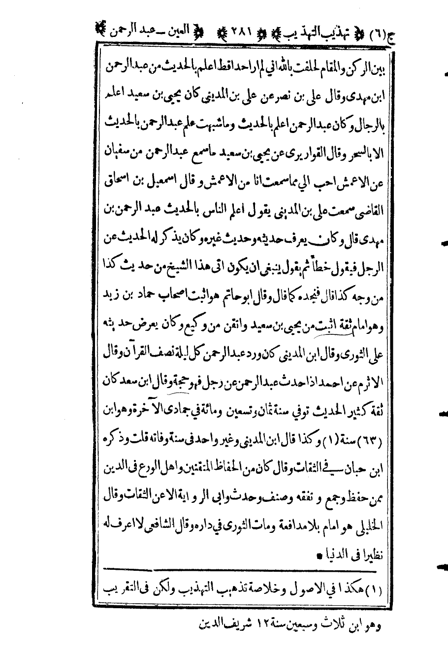 1 هكذا في الأصول وخلاصة تهذيب التهذيب ولكن في التقريب وهو ابن ثلاث وسبعين سنة 12 شريف الدين.
