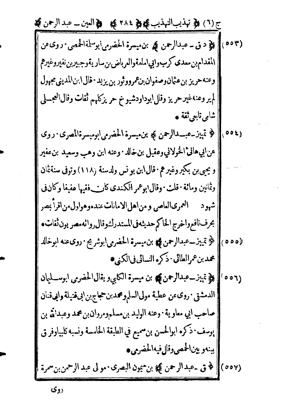 557 - "تمييز عبد الرحمن" بن ميسرة الحضرمي أبو ميسرة المصري روى عن أبي هانئ الخولاني وعقيل بن خالد وعنه ابن وهب وسعيد بن عفير ويحيى بن بكير وغيرهم قال ابن يونس ولد سنة "118" وتوفي سنة ثمان وثمانين ومائة قلت وقال أبو عمر الكندي كان فقيها عفيفا وكان في شهود العمري العاصي ومن أهل الأمانات عنده وهو أول من اقرأ بمصر بحرف نافع وأخرج الحاكم حديثه في المستدرك وقال رواته مصريون ثقات.