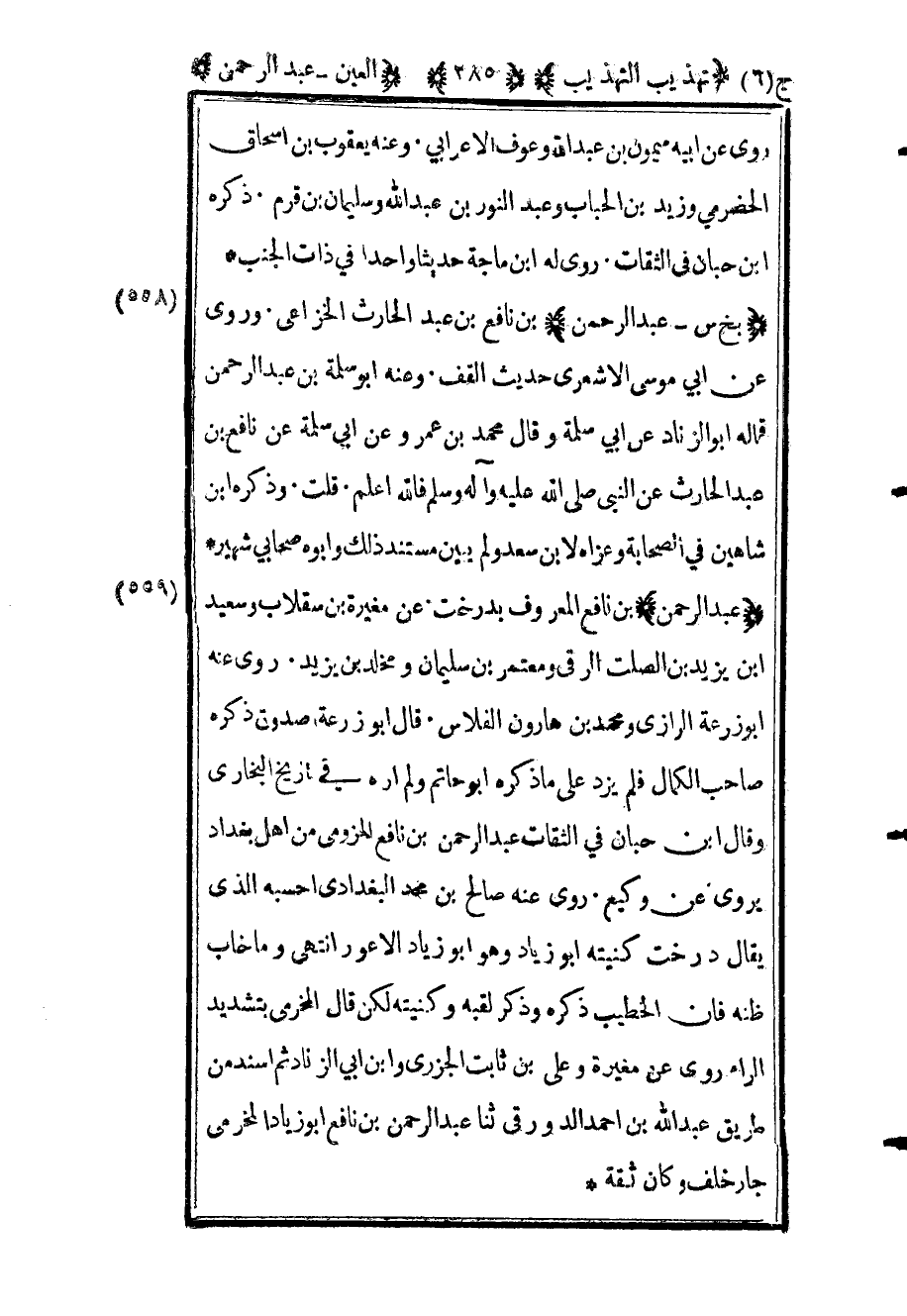562 - "عبد الرحمن" بن نافع المعروف بدرخت عن المغيرة بن سقلاب وسعيد بن يزيد بن الصلت الرقي ومعتمر بن سليمان ومخلد بن يزيد روى عنه أبو زرعة الرازي ومحمد بن هارون الفلاس قال أبو زرعة صدوق ذكره صاحب الكمال فلم يزد على ما ذكره أبو حاتم ولم أره في تاريخ البخاري وقال ابن حبان في الثقات عبد الرحمن بن نافع المخزومي من أهل بغداد عن وكيع روى عنه صالح بن محمد البغدادي أحسبه الذي يقال درخت كنيته أبو زياد وهو أبو زياد الأعور انتهى وما خاب ظنه فإن الخطيب ذكره وذكر لقبه وكنيته لكن قال المخرمي بتشديد الراء روى عن المغيرة وعلي بن ثابت الجزري وابن أبي الزناد ثم أسند من طريق عبد الله بن أحمد الدورقي ثنا عبد الرحمن بن نافع أبو زياد المخرمي جار خلف وكان ثقة.