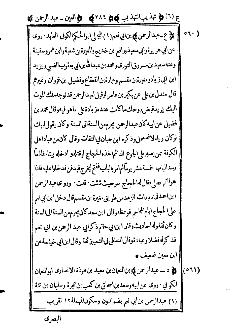 563 - "ع عبد الرحمن" بن أبي نعم1 البجلي أبو الحكم الكوفي العابد روى عن أبي هريرة وأبي سعيد ورافع بن خديج والمغيرة بن شعبة وابن عمر وسفينة وعنه سعيد بن مسروق الثوري ومحمد بن عبد الله بن أبي يعقوب الضبي ويزيد بن أبي زياد ومغيرة بن مقسم وعمارة بن القعقاع وفضيل بن غزوان وغيرهم قال مندل بن علي عن بكير بن عامر لو قيل لعبد الرحمن قد توجه ملك الموت إليك يريد قبض روحك ما كانت عنده زيادة على ما هو فيه وقال محمد بن فضيل عن أبيه كان عبد الرحمن يحرم من السنة إلى السنة وكان يقول لبيك لو كان رياء لاضمحل وذكره ابن حبان في الثقات وقال كان من عباد أهل الكوفة ممن يصبر على الجوع الدائم أخذه الحجاج ليقتله وأدخله بيتا مظلما وسد الباب خمسة عشر يوما ثم أمر بالباب ففتح ليخرج فيدفن فدخلوا عليه فإذا هو قائم يصلي فقال له الحجاج سر حيث شئت قلت وروى عبد الرحمن بن أحمد في زيادات الزهد من طريق مغيرة بن مقسم قال دخل بن أبي نعم على الحجاج أيام الجماجم فوعظه وقال ابن سعد كان يحرم من السنة إلى السنة وكان ثقة وله أحاديث وقال ابن أبي حاتم ذكر أبي عبد الرحمن بن أبي نعم فذكر له فضلا وعبادة وقال النسائي في التمييز ثقة وقال ابن أبي خيثمة عن ابن معين ضعيف.