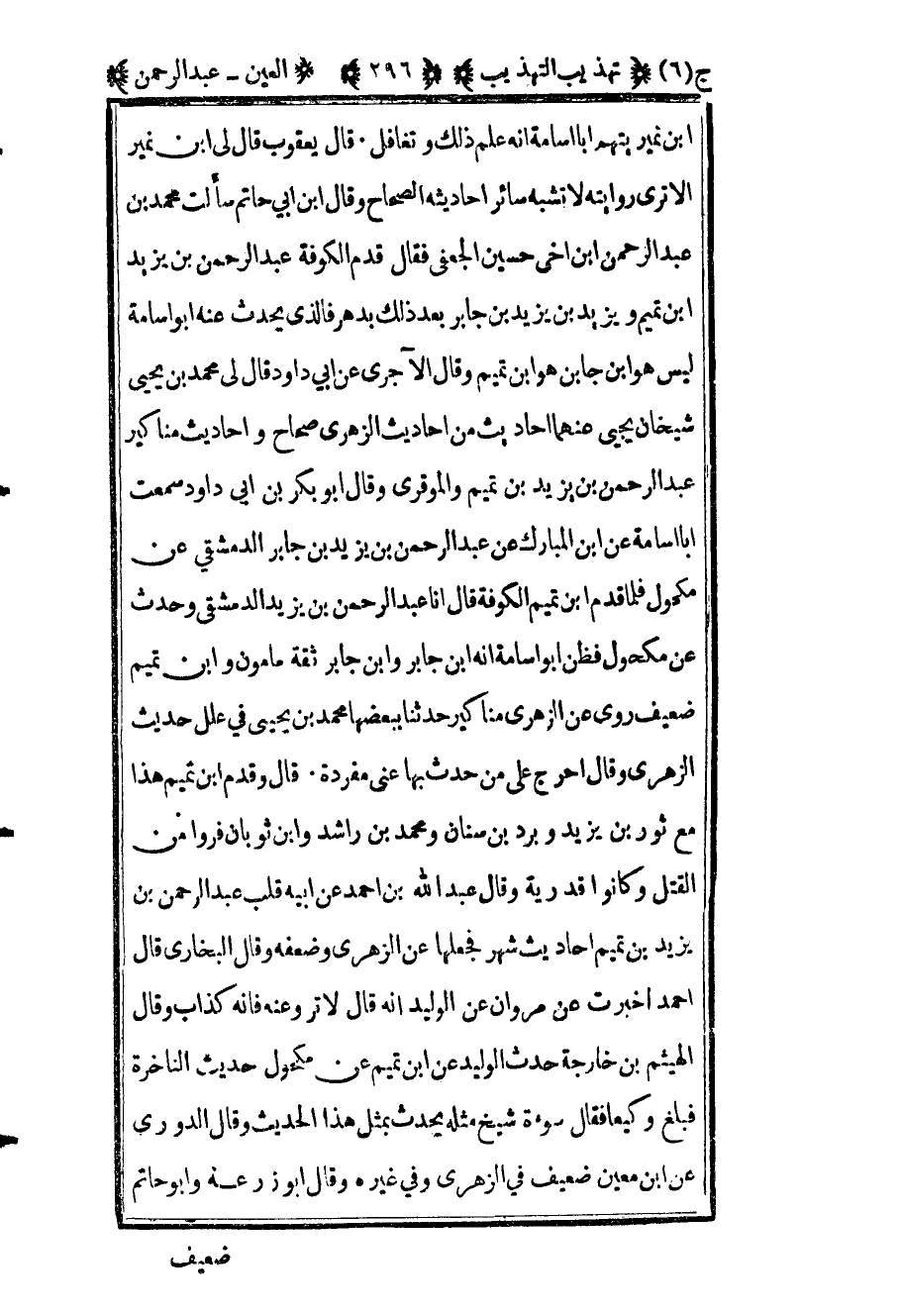 ابن نمير يتهم أبا أسامة أنه علم ذلك وتغافل قال يعقوب قال لي بن نمير ألا ترى روايته لا تشبه سائر أحاديثه الصحاح وقال ابن أبي حاتم سألت محمد بن عبد الرحمن بن أخي حسين الجعفي فقال قدم الكوفة عبد الرحمن بن يزيد بن تميم ويزيد بن يزيد بن جابر بعد ذلك بدهر الذي يحدث عنه أبو أسامة ليس هو ابن جابر هو ابن تميم وقال الآجري عن أبي داود قال لي محمد بن يحيى شيخان يجيء عنهما أحاديث من أحاديث الزهري صحاح وأحاديث مناكير عبد الرحمن ابن يزيد بن تميم والموقري وقال أبو بكر بن أبي داود سمعت أبا أسامة عن ابن المبارك عن عبد الرحمن بن يزيد بن جابر الدمشقي عن مكحول فلما قدم بن تميم الكوفة قال أنا عبد الرحمن بن يزيد الدمشقي وحدث عن مكحول فظن أبو أسامة أنه بن جابر وابن جابر ثقة مأمون وابن تميم ضعيف روى عن الزهري مناكير حدثنا ببعضها محمد بن يحيى في علل حديث الزهري وقال أحرج على من حدث بها عني مفردة قال وقدم بن تميم هذا مع ثور بن يزيد وبرد بن سنان ومحمد بن راشد وابن ثوبان فروا من القتل وكانوا قدرية وقال عبد الله بن أحمد عن أبيه قلب عبد الرحمن بن يزيد بن تميم أحاديث شهر فجعلها عن الزهري وضعفه وقال البخاري قال أحمد أخبرت عن مروان عن الوليد أنه قال لا ترو عنه فإنه كذاب وقال الهيثم بن خارجة حدث الوليد عن ابن تميم عن مكحول حديث الناخرة فبلغ وكيعا فقال سوءة شيخ مثله يحدث بمثل هذا الحديث وقال الدوري عن ابن معين ضعيف في الزهري وفي غيره وقال أبو زرعة وأبو حاتم