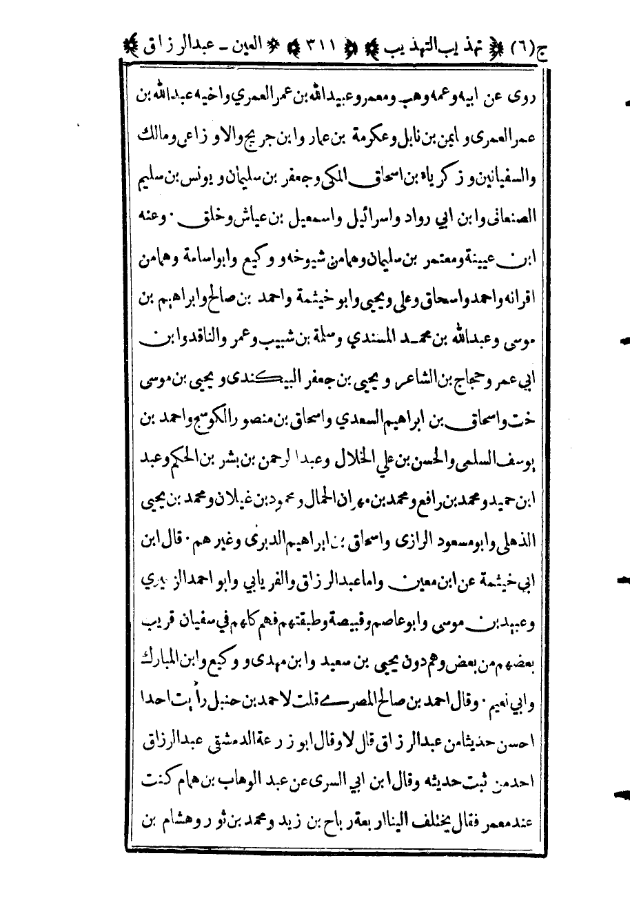 روى عن أبيه وعمه وهب ومعمر وعبيد الله بن عمر العمري وأخيه عبد الله بن عمر العمري وأيمن بن نابل وعكرمة بن عمار وابن جريج والأوزاعي ومالك والسفيانين وزكرياء بن إسحاق المكي وجعفر بن سليمان ويونس بن سليم الصنعاني وابن أبي رواد وإسرائيل وإسماعيل بن عياش وخلق وعنه ابن عيينة ومعتمر بن سليمان وهما من شيوخه ووكيع وأبو أسامة وهما من أقرانه وأحمد وإسحاق وعلي ويحيى وأبو خيثمة وأحمد بن صالح وإبراهيم بن موسى وعبد الله بن محمد المسندي وسلمة بن شبيب وعمرو الناقد وابن أبي عمرر وحجاج بن الشاعر ويحيى بن جعفر البيكندي ويحيى بن موسى خت وإسحاق بن إبراهيم السعدي وإسحاق بن منصور الكوسج وأحمد بن يوسف السلمي والحسن بن علي الخلال وعبد الرحمن بن بشر بن الحكم وعبد بن حميد ومحمد بن رافع ومحمد بن مهران الحمال ومحمود بن غيلان ومحمد بن يحيى الذهلي وأبو مسعود الرازي وإسحاق بن إبراهيم الدبري وغيرهم قال ابن أبي خيثمة عن ابن معين وأما عبد الرزاق والفريابي وأبو أحمد الزبيري وعبيد بن موسى وأبو عاصم وقبيصة وطبقتهم فهم كلهم في سفيان قريب بعضهم من بعض وهم دون يحيى بن سعيد وابن مهدي ووكيع وابن المبارك وأبي نعيم وقال أحمد بن صالح المصري قلت لأحمد بن حنبل رأيت أحدا أحسن حديثا من عبد الرزاق قال لا وقال أبو زرعة الدمشقي عبد الرزاق أحد من ثبت حديثه وقال ابن أبي السري عن عبد الوهاب بن همام كنت عند معمر فقال يختلف إلينا أربعة رباح بن زيد ومحمد بن ثور وهشام بن