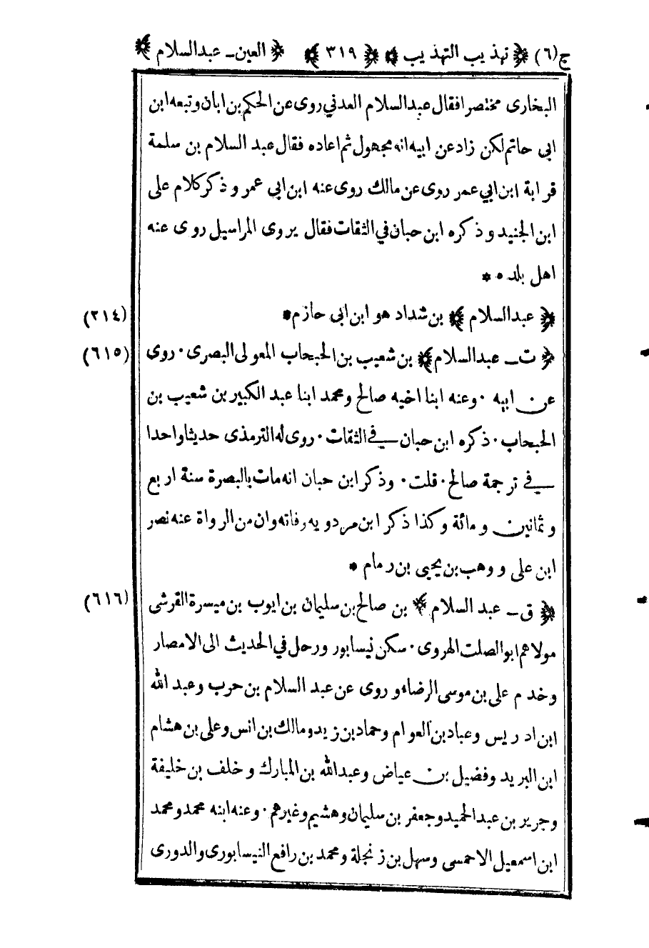 619 - "ق عبد السلام" بن صالح بن سليمان بن أيوب بن ميسرة القرشي مولاهم أبو الصلت الهروي سكن نيسابور ورحل في الحديث إلى الأمصار وخدم علي بن موسى الرضاء وروى عن عبد السلام بن حرب وعبد الله بن إدريس وعباد بن العوام وحماد بن زيد ومالك بن أنس وعلي ابن هشام بن البريد وفضيل بن عياض وعبد الله بن المبارك وخلف بن خليفة وجرير بن عبد الحميد وجعفر بن سليمان وهشيم وغيرهم وعنه ابنه محمد ومحمد بن إسماعيل الأحمسي وسهل ابن زنجلة ومحمد بن رافع النيسابوري والدوري