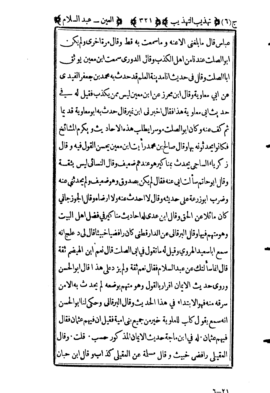 عباس قال ما بلغني إلا عنه وما سمعت به قط وقال مرة أخرى ولم يكن أبو الصلت عندنا من أهل الكذب وقال الدوري سمعت ابن معين يوثق أبا الصلت وقال في حديث أنا مدينة العلم قد حدث به محمد بن جعفر الفيدي عن أبي معاوية وقال ابن محرز عن ابن معين ليس ممن يكذب فقيل له في حديث أبي معاوية هذا فقال أخبرني ابن نمير قال حدث به أبو معاوية قديما ثم كف عنه وكان أبو الصلت موسرا يطلب هذه الأحاديث ويكرم المشائخ فكانوا يحدثونه بها وقال صالح بن محمد رأيت بن معين يحسن القول فيه وقال زكريا الساجي يحدث مناكير هو عندهم ضعيف وقال النسائي ليس بثقة وقال أبو حاتم سألت أبي عنه فقال لم يكن بصدوق وهو ضعيف ولم يحدثني عنه وضرب أبو زرعة على حديثه وقال لا أحدث عنه ولا أرضاه وقال الجوزجاني كان مائلا عن الحق وقال ابن عدي له أحاديث مناكير في فضل أهل البيت وهو متهم فيها وقال البرقاني عن الدارقطني كان رافضيا خبيثا قال لي دعلج إنه سمع أبا سعيد الهروي وقيل له ما تقول في أبي الصلت قال نعم بن الهضيم ثقة قال إنما سألتك عن عبد السلام فقال نعم ثقة ولم يزد على هذا قال أبو الحسن وروى حديث الإيمان إقرار بالقول وهو متهم بوضعه لم يحدث به الا من سرقه منه فهو الابتداء في هذا الحديث وقال البرقاني وحكى لنا أبو الحسن أنه سمع يقول كلب للعلوية خير من جميع بني أمية فقيل إن فيهم عثمان فقال فيهم عثمان له في ابن ماجة حديث الإيمان المذكور حسب قلت وقال العقيلي رافضي خبيث وقال مسلمة عن العقيلي كذاب وقال ابن حبان