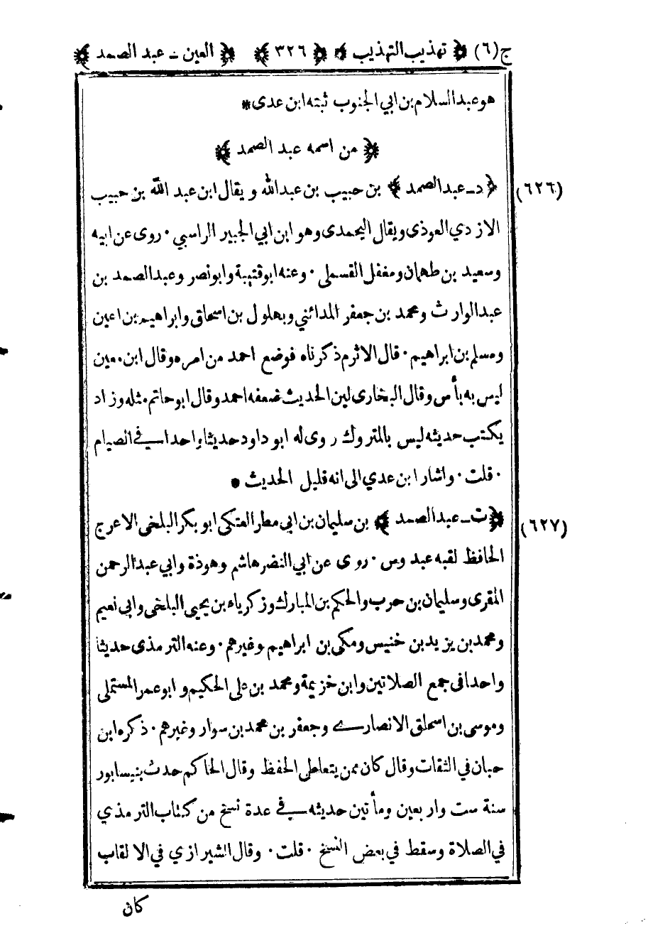 630 - "ت عبد الصمد" بن سليمان بن أبي مطر العتكي أبو بكر البلخي الأعرج الحافظ لقبه عبدوس روى عن أبي النضر هاشم وهوذة وأبي عبد الرحمن المقري وسليمان بن حرب والحكم ابن المبارك وزكرياء بن يحيى البلخي وأبي نعيم ومحمد بن يزيد بن خنيس ومكي بن إبراهيم وغيرهم وعنه الترمذي حديثا واحدا في جمع الصلاتين وابن خزيمة ومحمد بن علي الحكيم وأبو عمر المستملى وموسى بن إسحاق الأنصاري وجعفر بن محمد بن سوار وغيرهم ذكره بن حبان في الثقات وقال كان ممن يتعاطى الحفظ وقال الحاكم حدث بنيسابور سنة ست وأربعين ومائتين حديثه في عدة نسخ من كتاب الترمذي في الصلاة وسقط في بعض النسخ قلت وقال الشيرازي في الألقاب