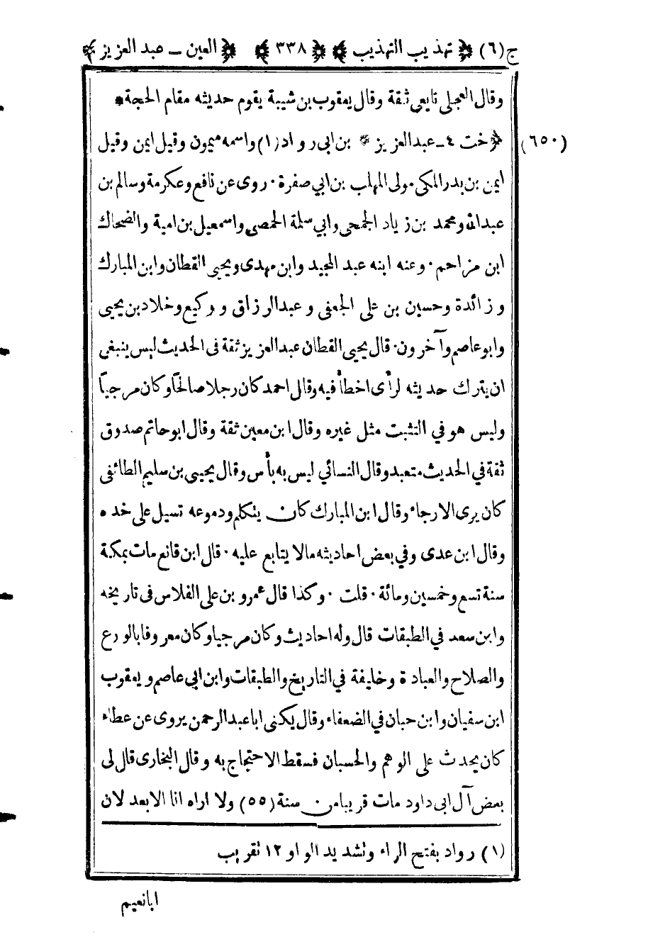 653 - "خت 4 عبد العزيز" بن أبي رواد1 واسمه ميمون وقيل أيمن وقيل أيمن بن بدر المكي مولى المهلب بن أبي صفرة روى عن نافع وعكرمة وسالم بن عبد الله ومحمد بن زياد الجمحي وأبي سلمة الحمصي وإسماعيل بن أمية والضحاك بن مزاحم وعنه ابنه عبد المجيد وابن مهدي ويحيى القطان وابن المبارك وزائدة وحسين بن علي الجعفي وعبد الرزاق ووكيع وخلاد بن يحيى وأبو عاصم وآخرون قال يحيى القطان عبد العزيز ثقة في الحديث ليس ينبغي أن يترك حديثه لرأي أخطأ فيه وقال أحمد كان رجلا صالحا وكان مرجيا وليس هو في التثبت مثل غيره وقال ابن معين ثقة وقال أبو حاتم صدوق ثقة في الحديث متعبد وقال النسائي ليس به بأس وقال يحيى ابن سليم الطائفي كان يرى الإرجاء وقال ابن المبارك كان يتكلم ودموعه تسيل على خده وقال ابن عدي وفي بعض أحاديثه ما لا يتابع عليه قال ابن قانع مات بمكة سنة تسع وخمسين ومائة قلت وكذا قال عمرو بن علي الفلاس في تاريخه وابن سعد في الطبقات قال وله أحاديث وكان مرجيا وكان معروفا بالورع والصلاح والعبادة وخليفة في التاريخ والطبقات وابن أبي عاصم ويعقوب بن سفيان وابن حبان في الضعفاء وقال يكنى أبا عبد الرحمن يروي عن عطاء كان يحدث على الوهم والحسبان فسقط الاحتجاج به وقال البخاري قال لي بعض آل أبي داود مات قريبا من سنة "55" ولا أراه أنا إلا بعد لأن