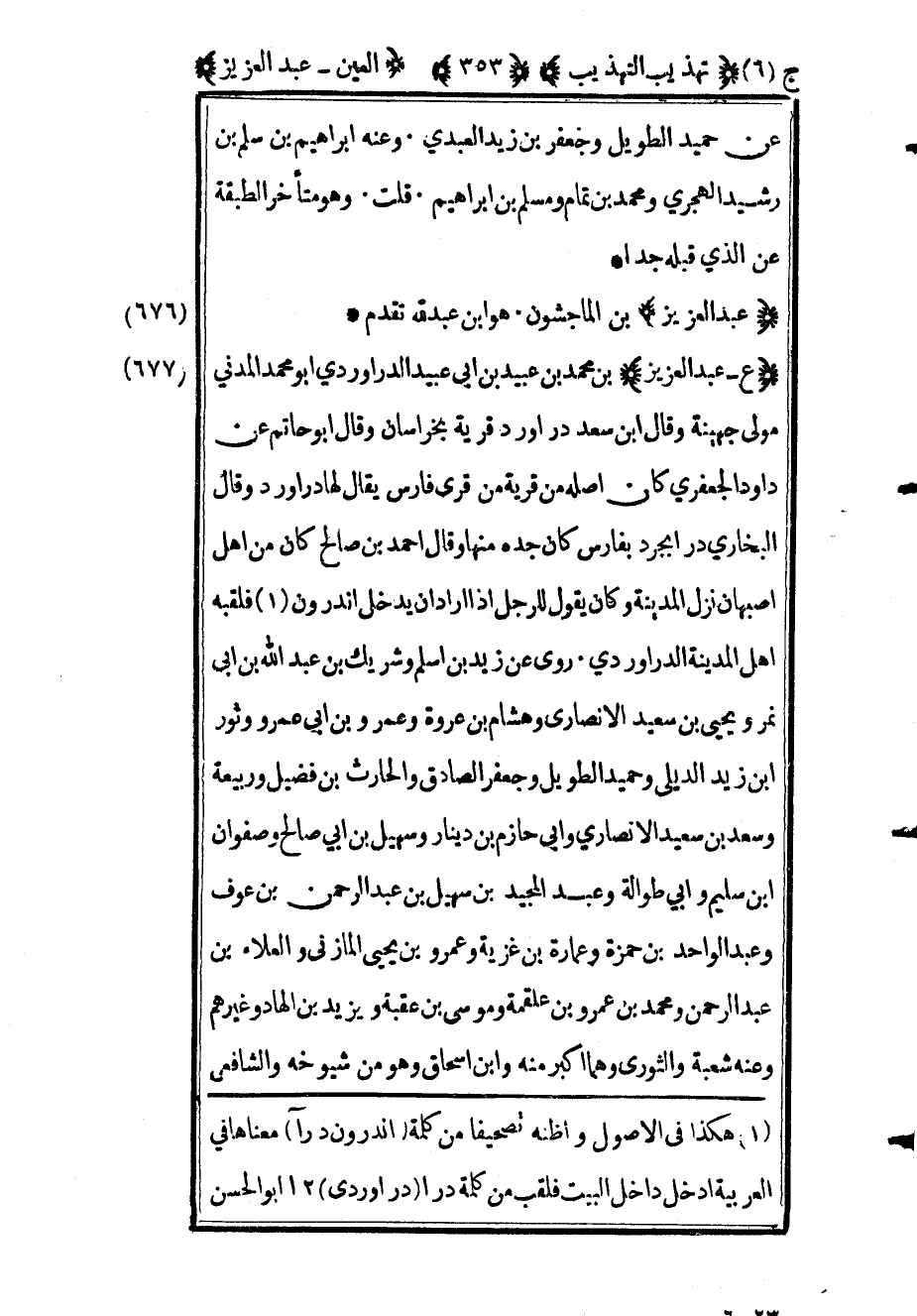 680 - "ع عبد العزيز" بن محمد بن عبيد بن أبي عبيد الدراوردي أبو محمد المدني مولى جهينة وقال ابن سعد دراورد قرية بخراسان وقال أبو حاتم عن داود الجعفري كان أصله من قرية من قرى فارس يقال لها دراورد وقال البخاري داربجرد بفارس كان جده منها وقال أحمد بن صالح كان من أهل أصبهان نزل المدنية وكان يقول للرجل إذا أراد أن يدخل اندرون1 فلقبه أهل المدينة الدراوردي روى عن زيد بن أسلم وشريك بن عبد الله بن أبي نمر ويحيى بن سعيد الأنصاري وهشام بن عروة وعمرو بن أبي عمرو وثور بن زيد الديلي وحميد الطويل وجعفر الصادق والحارث بن فضيل وربيعة وسعد بن سيعد الأنصاري وأبي حازم بن دينار وسهل بن أبي صالح وصفوان بن سليم وأبي طوالة وعبد المجيد بن سهيل بن عبد الرحمن بن عوف وعبد الواحد بن حمزة وعمارة بن غزية وعمرو بن يحيى المازني والعلاء بن عبد الرحمن ومحمد بن عمرو بن علقمة وموسى بن عقبة ويزيد بن الهاد وغيرهم وعنه شعبة والثوري وهما أكبر منه وابن إسحاق وهو من شيوخه والشافعي